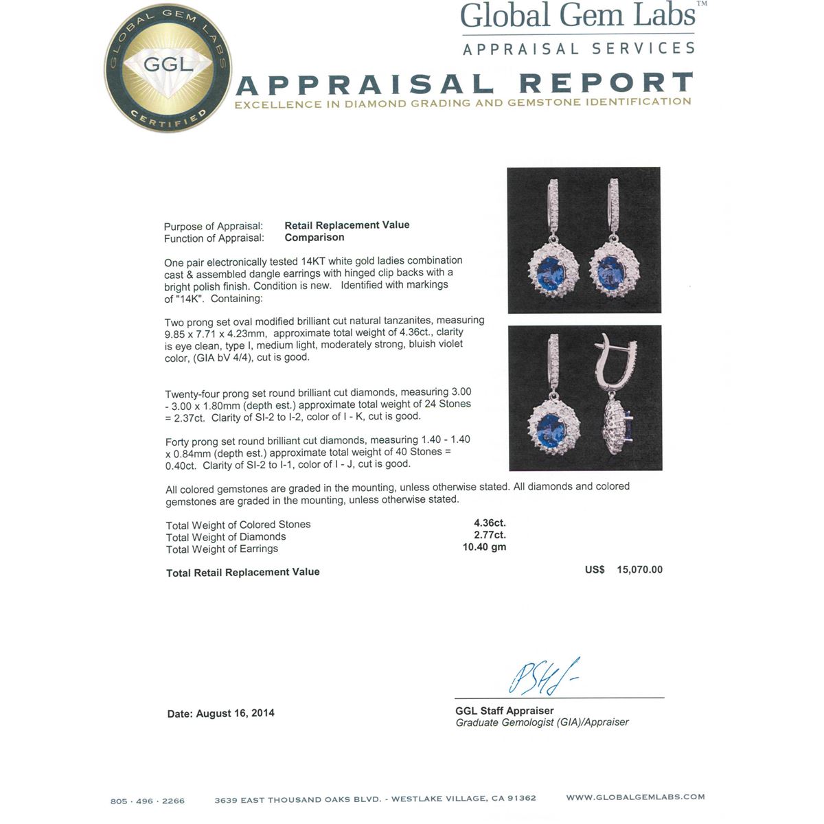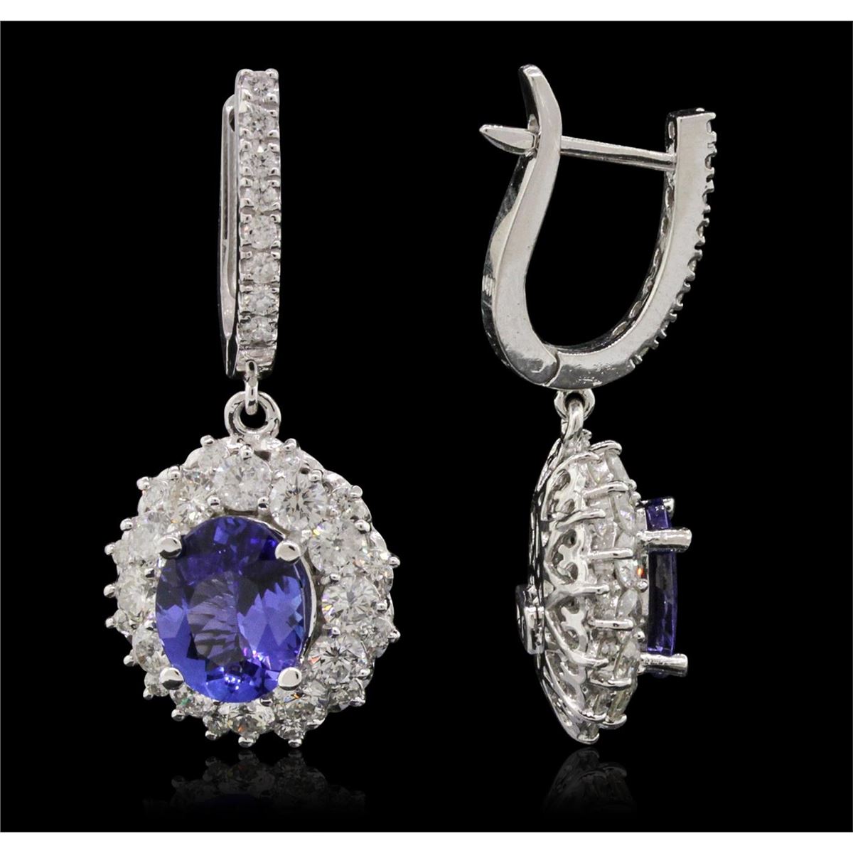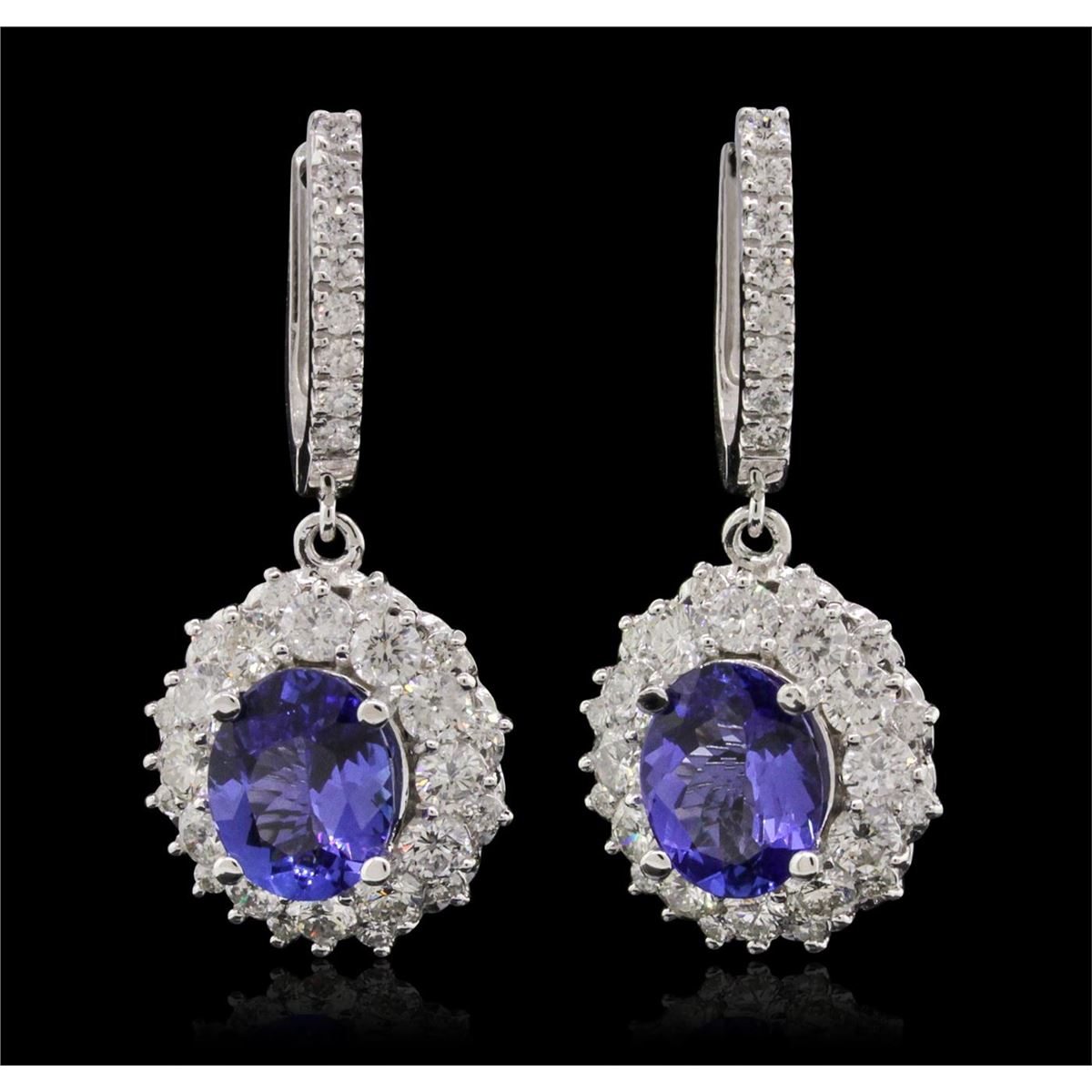 One pair electronically tested 14KT white gold ladies combination cast & assembled dangle earrings with hinged clip backs with a bright polish finish. Condition is new. Identified with markings of "14K". Containing: Two prong set oval modified brilliant cut natural tanzanites, measuring 9.85 x 7.71 x 4.23mm, approximate. Total Weight of 4.36ct., clarity is eye clean, type I, medium light, moderately strong, bluish violet color, (GIA bV 4/4), cut is good. Twenty-Four prong set round brilliant cut diamonds, measuring 3.00 - 3.00 x 1.80mm (depth est.) approximate. Total Weight of 24 Stones = 2.37ct. Clarity: SI-2 to I-2. Color: I - K, Cut is Good. Forty prong set round brilliant cut diamonds, measuring 1.40 - 1.40 x 0.84mm (depth est.) approximate. Total Weight of 40 Stones = 0.40ct. Clarity: SI-2 to I-1. Color: I - J, Cut is Good. All colored gemstones are graded in the mounting, unless otherwise stated. All diamonds and colored gemstones are graded in the mounting, unless otherwise stated. Total Weight of Colored Stones 4.36ct. Total Weight of Diamonds 2.77ct. Total Weight of Earrings 10.40 grams. GGL Appraised at $15,070.00.