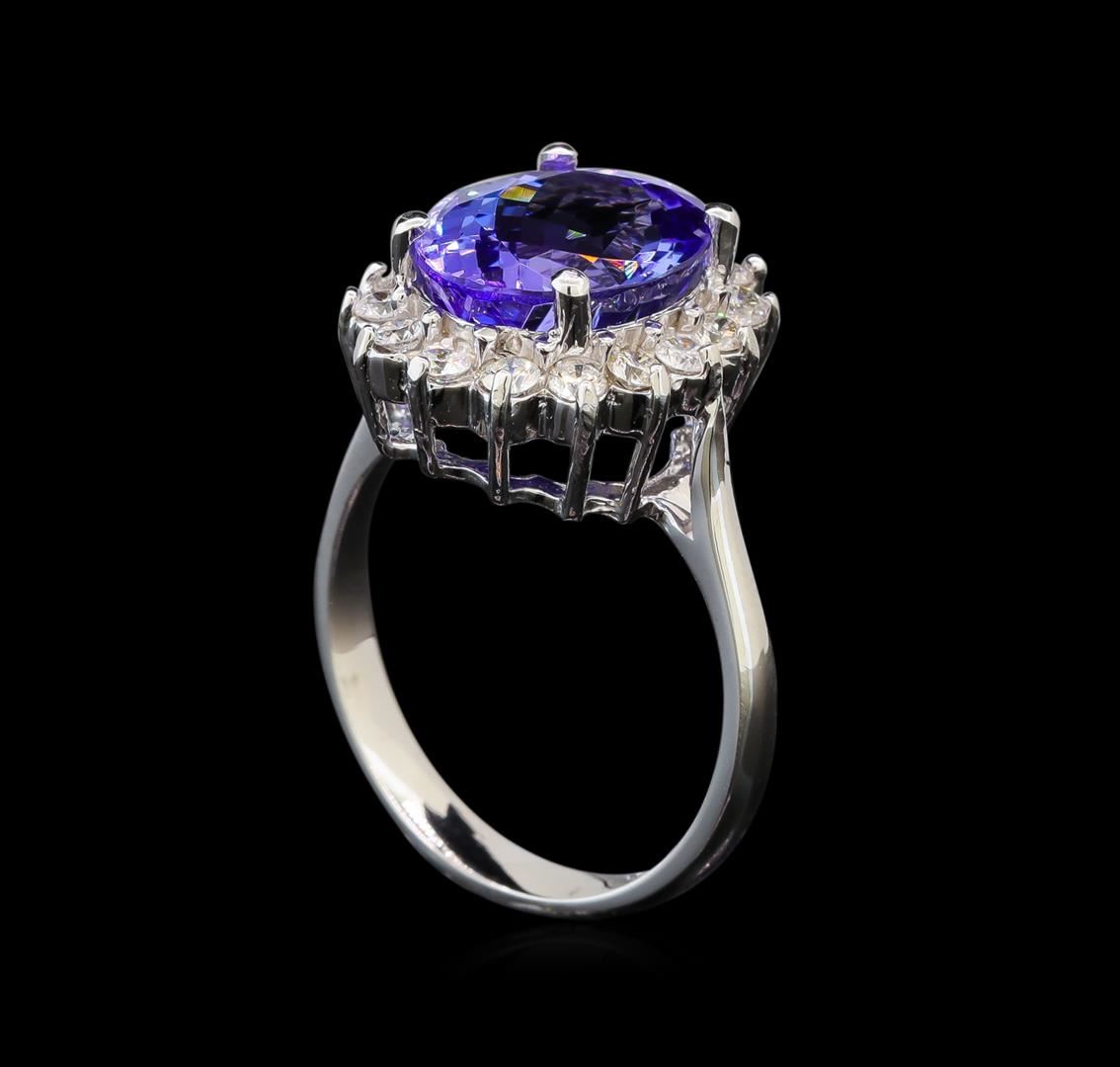 One electronically tested 14KT white gold ladies cast tanzanite and diamond ring with a bright polish finish. Identified with markings of "K14". Condition is new. Containing: One prong set oval modified brilliant cut natural tanzanite, measuring 11.80 x 9.00 x 5.85mm, approximate weight of 4.37ct., clarity is eye clean, type I, medium light, slightly grayish, violet color, (GIA V 4/2), cut is good. Sixteen prong set round brilliant cut diamonds, measuring 1.90 - 1.90 x 1.14mm (depth est.) approximate total weight of 16 Stones = 0.40ct. Clarity: SI-1. Color: H - I, Cut is Good. Colored gemstones are presumed to have been subjected to commonly used enhancement processes. All diamonds and colored gemstones are graded in the mounting, unless otherwise stated. Total Weight of Colored Stones 4.37ct. Total Weight of Diamonds 0.40ct. Total Weight of Ring 5.10 grams. GGL Appraised at $4,110.00.