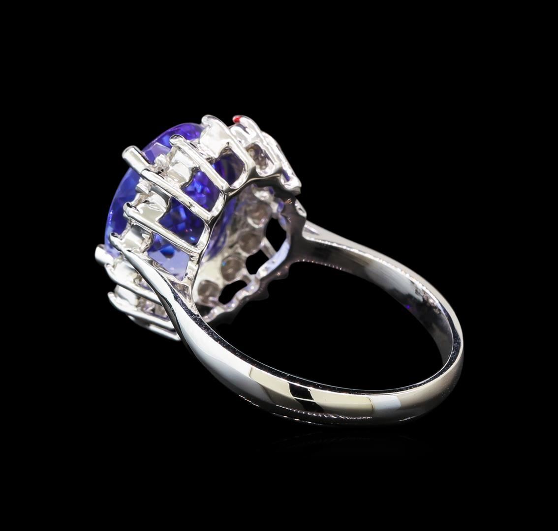 One electronically tested 14KT white gold ladies cast tanzanite and diamond ring with a bright polish finish. Identified with markings of "K14". Condition is new. Containing: One prong set oval modified brilliant cut natural tanzanite, measuring 11.80 x 9.00 x 5.85mm, approximate weight of 4.37ct., clarity is eye clean, type I, medium light, slightly grayish, violet color, (GIA V 4/2), cut is good. Sixteen prong set round brilliant cut diamonds, measuring 1.90 - 1.90 x 1.14mm (depth est.) approximate total weight of 16 Stones = 0.40ct. Clarity: SI-1. Color: H - I, Cut is Good. Colored gemstones are presumed to have been subjected to commonly used enhancement processes. All diamonds and colored gemstones are graded in the mounting, unless otherwise stated. Total Weight of Colored Stones 4.37ct. Total Weight of Diamonds 0.40ct. Total Weight of Ring 5.10 grams. GGL Appraised at $4,110.00.
