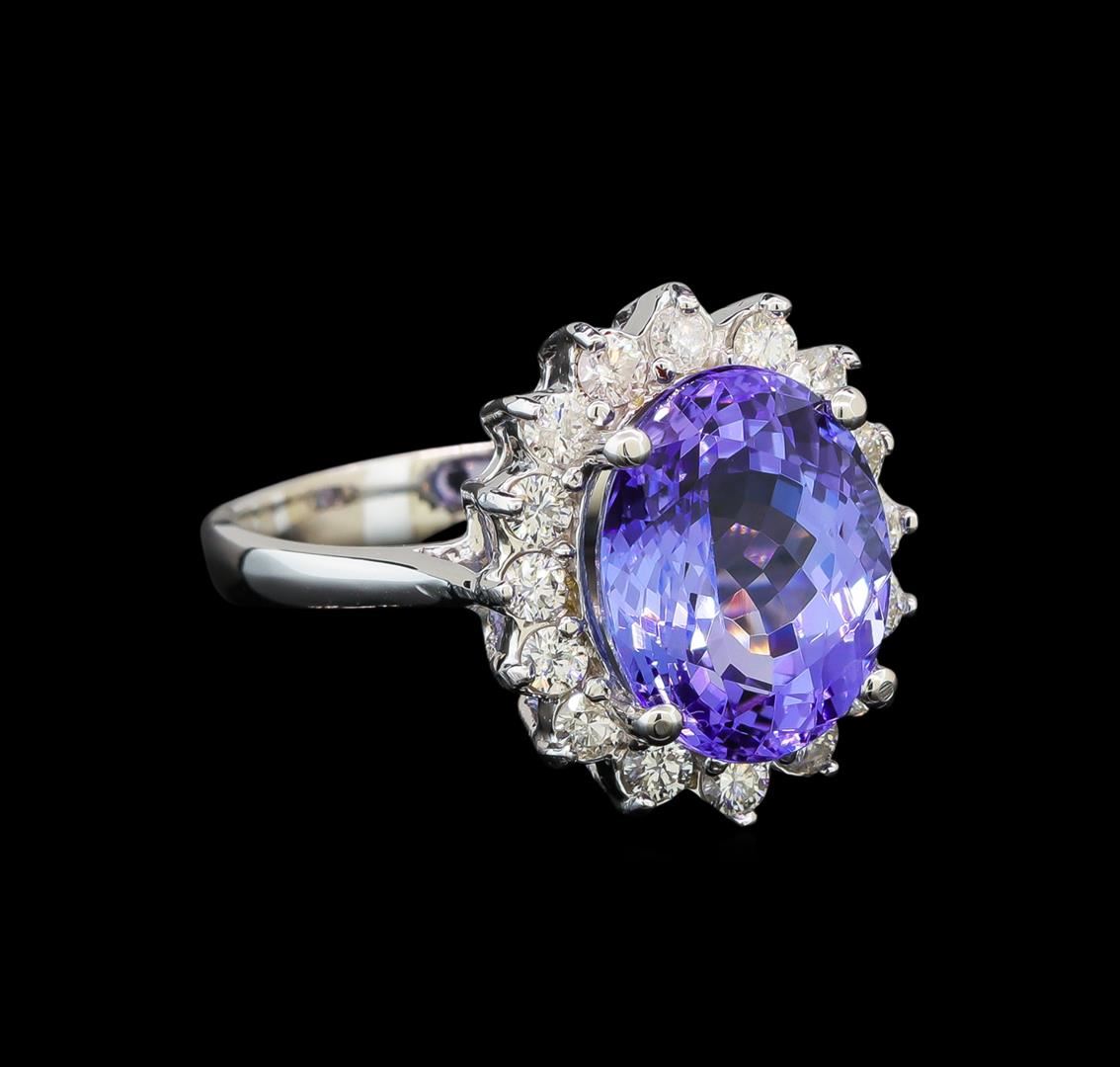 One electronically tested 14KT white gold ladies cast tanzanite and diamond ring with a bright polish finish. Identified with markings of "K14". Condition is new. Containing: One prong set oval modified brilliant cut natural tanzanite, measuring 11.80 x 9.00 x 5.85mm, approximate weight of 4.37ct., clarity is eye clean, type I, medium light, slightly grayish, violet color, (GIA V 4/2), cut is good. Sixteen prong set round brilliant cut diamonds, measuring 1.90 - 1.90 x 1.14mm (depth est.) approximate total weight of 16 Stones = 0.40ct. Clarity: SI-1. Color: H - I, Cut is Good. Colored gemstones are presumed to have been subjected to commonly used enhancement processes. All diamonds and colored gemstones are graded in the mounting, unless otherwise stated. Total Weight of Colored Stones 4.37ct. Total Weight of Diamonds 0.40ct. Total Weight of Ring 5.10 grams. GGL Appraised at $4,110.00.