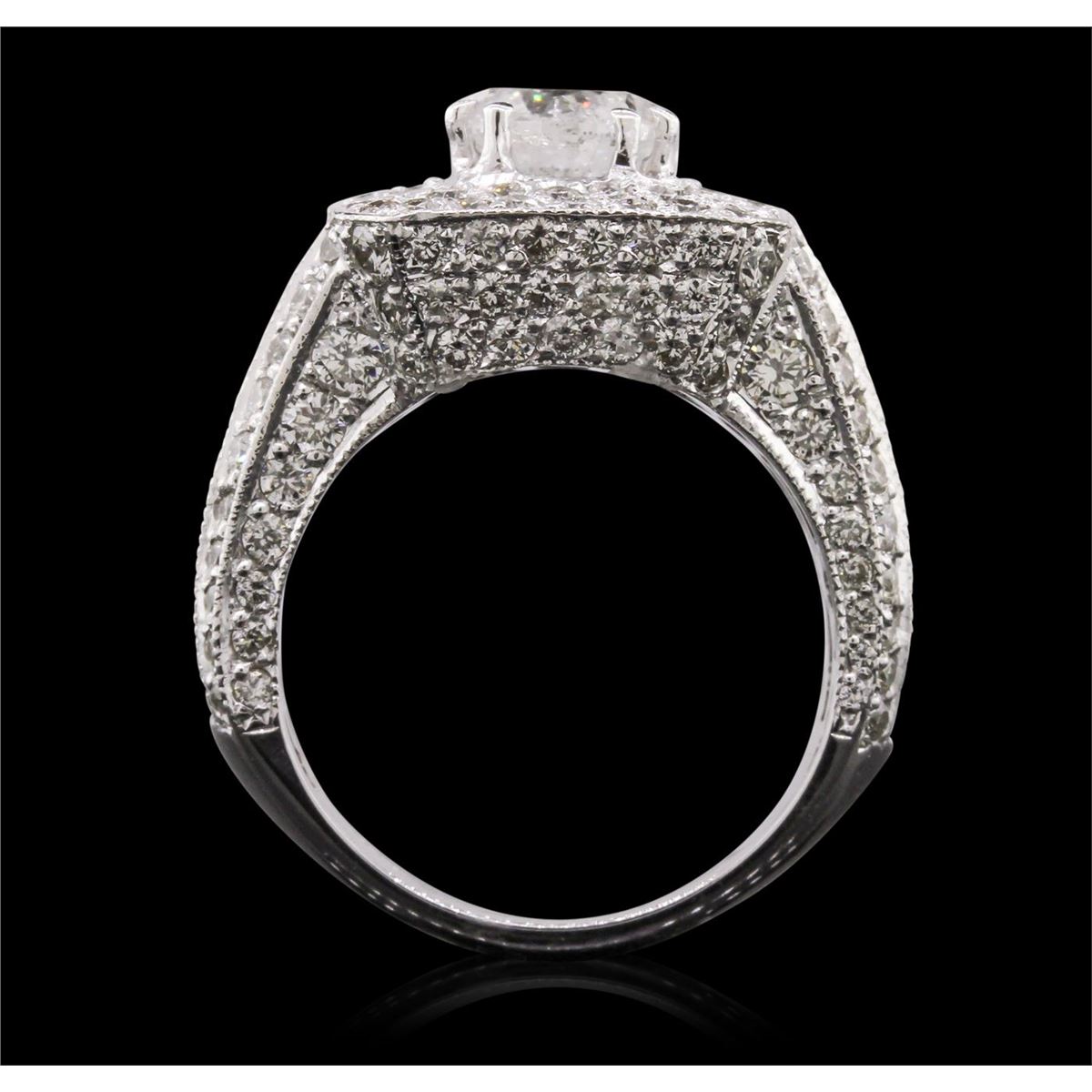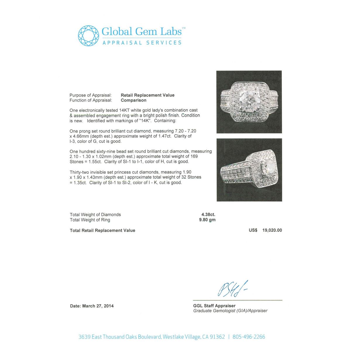 One electronically tested 14KT white gold Ladies combination cast & assembled engagement ring with a bright polish finish. Condition is new. Identified with markings of "14K". Containing: One prong set round brilliant cut diamond, measuring 7.20 - 7.20 x 4.66mm (depth est.) approximate weight of 1.47ct. Clarity: I-3. Color: G, Cut is Good. One Hundred Sixty-Nine bead set round brilliant cut diamonds, measuring 2.10 - 1.30 x 1.02mm (depth est.) approximate. Total Weight of 169 Stones = 1.55ct. Clarity: SI-1 to I-1. Color: H, Cut is Good. Thirty-Two invisible set princess cut diamonds, measuring 1.90 x 1.90 x 1.43mm (depth est.) approximate. Total Weight of 32 Stones = 1.35ct. Clarity: SI-1 to SI-2. Color: I - K, Cut is Good. Total Weight of Diamonds 4.38ct. Total Weight of Ring 9.80 grams. GGL Appraised at $19,020.00.