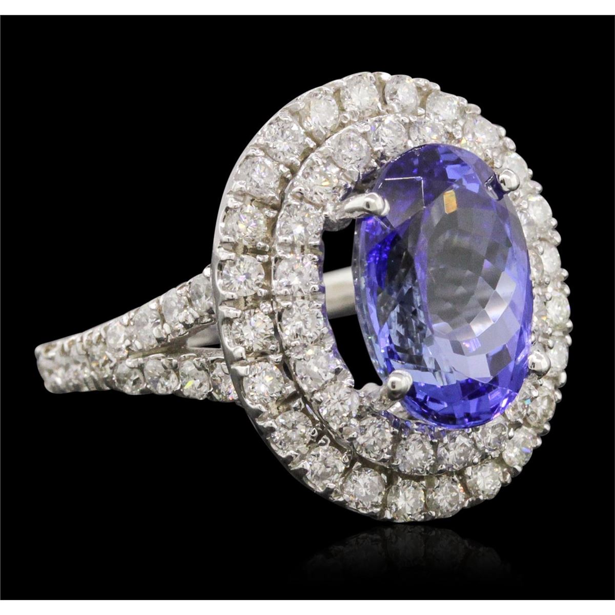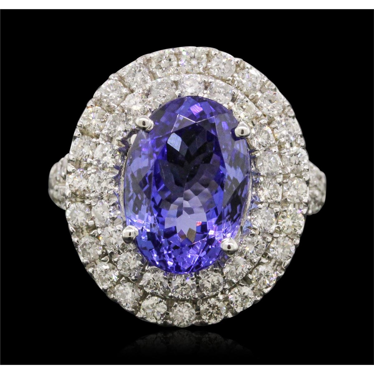 One electronically tested 14KT white gold ladies combination cast & assembled ring with a bright polish finish. Condition is new. Identified with markings of "K14". Containing: One prong set oval modified brilliant cut natural tanzanite, measuring 12.59 x 8.82 x 5.73mm, approximate weight of 4.40ct., clarity is eye clean, type I, medium, moderately strong, bluish violet color, (GIA bV 5/4), cut is good. Sixty-Eight prong set round brilliant cut diamonds, measuring 1.90 - 1.90 x 1.14mm (depth est.) approximate. Total Weight of 68 Stones = 1.71ct. Clarity: SI-2 to I-2. Color: J - L, Cut is Good. Colored gemstones are presumed to have been subjected to commonly used enhancement processes. All diamonds and colored gemstones are graded in the mounting, unless otherwise stated. Total Weight of Colored Stones 4.40ct. Total Weight of Diamonds 1.71ct. Total Weight of Ring 7.80 grams. GGL Appraised at $11,610.00.