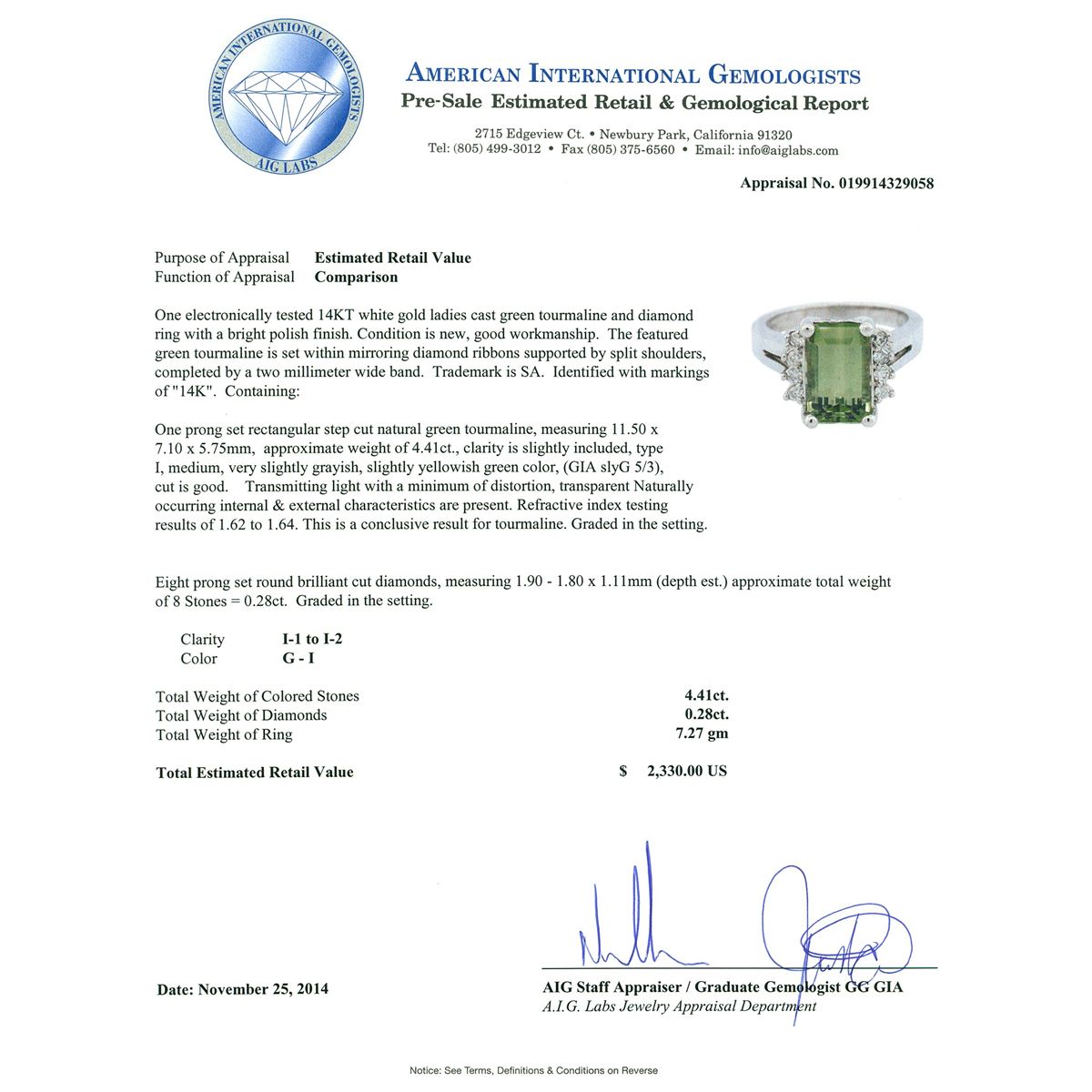 One electronically tested 14KT white gold ladies cast green tourmaline and diamond ring with a bright polish finish. The featured green tourmaline is set within mirroring diamond ribbons supported by split shoulders, completed by a two millimeter wide band. Trademark is SA. Identified with markings of "14K". Condition is new, good workmanship. Containing: One prong set rectangular step cut natural green tourmaline, measuring 11.50 x 7.10 x 5.75mm, approximate weight of 4.41ct., clarity is slightly included, type I, medium, very slightly grayish, slightly yellowish green color, (GIA slyG 5/3), cut is good. Transmitting light with a minimum of distortion, transparent Naturally occurring internal & external characteristics are present. Refractive index testing results of 1.62 to 1.64. This is a conclusive result for tourmaline. Graded in the setting. Eight prong set round brilliant cut diamonds, measuring 1.90 - 1.80 x 1.11mm (depth est.) approximate total weight of 8 Stones = 0.28ct. Graded in the setting. Clarity: I-1 to I-2. Color: G - I. Total Weight of Colored Stones 4.41ct. Total Weight of Diamonds 0.28ct. Total Weight of Ring 7.27 grams. AIG Appraised at $2,330.00.