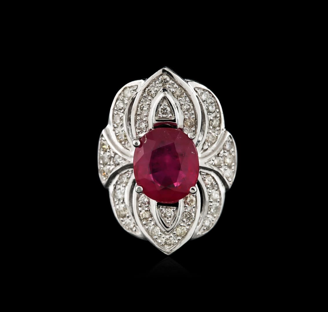 One electronically tested 14KT white gold ladies cast ruby and diamond ring with a bright polish finish. Identified with markings of "14K". Condition is new. Containing: One prong set oval modified brilliant cut natural ruby, measuring 10.93 x 9.51 x 5.00mm, approximate weight of 4.42ct., clarity is heavily included, medium dark, moderately strong, strongly purplish red color, (GIA stpR 6/4), cut is good. Forty prong set round brilliant cut diamonds, measuring 1.50 - 1.50 x 0.90mm (depth est.) approximate total weight of 40 Stones = 0.49ct. Clarity: I-1 to I-2. Color: I - J, Cut is Good. All diamonds and colored gemstones are graded in the mounting, unless otherwise stated. Colored gemstones are presumed to have been subjected to commonly used enhancement processes. Total Weight of Colored Stones 4.42ct. Total Weight of Diamonds 0.49ct. Total Weight of Ring 10.20 grams. GGL Appraised at $3,180.00.