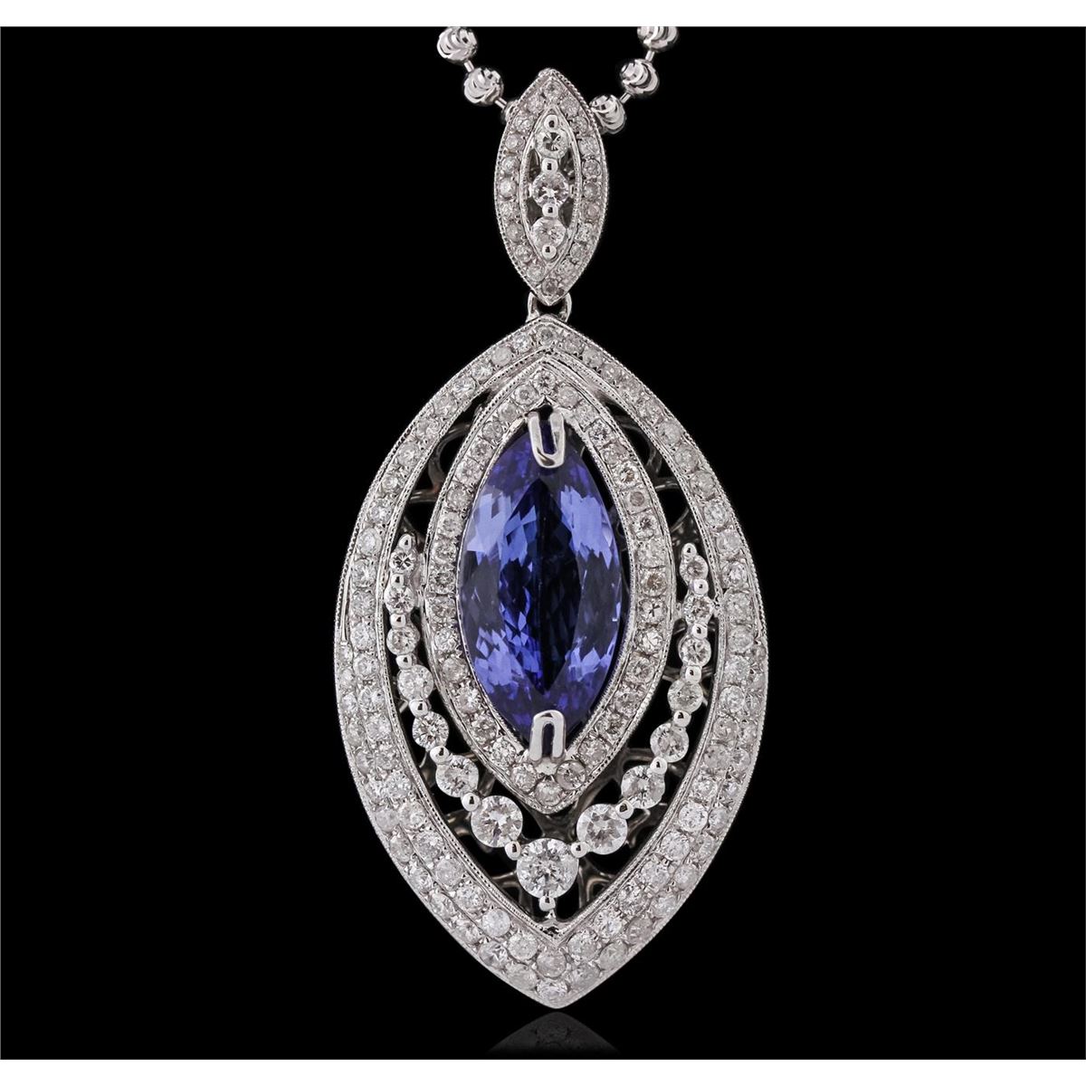 One electronically tested 14KT white gold ladies cast & assembled tanzanite and diamond pendant/enhancer with chain. The pendant/enhancer features a tanzanite set within an elaborate diamond set lattice gallery, completed by a diamond set bail with snap-locking bail with safety. The pendant/enhancer is supported by an eighteen inch length 14KT white gold designer style chain, terminating in a lobster claw clasp. Bright polish finish with milgrain detailing throughout. Trademark is Orianne. Identified with markings of "14K". Condition is new, good workmanship. Containing: One prong set marquise brilliant cut natural tanzanite, measuring 16.00 x 7.95 x 5.15mm, 6% bulge factor, approximate weight of 4.42ct., clarity is eye clean, type I, medium dark, very slightly grayish, bluish violet color, (GIA bV 6/3), cut is good. Transmitting light with no distortion, transparent. Graded in the setting. Tanzanite is a very rare gemstone that is only found in the country of Tanzania. Originally discovered in 1967. Tiffany & Company, named the stone Tanzanite. It is found in the Usumburu Mountains that border the Umba Valley of northern Tanzania. Tanzanite occurs in gray, brown, violet, blue, reddish-purple, & green. The gem is interesting because of its exceptional pleochroism. Rotated in different directions a tanzanite will exhibit multiple changes of color. Tanzanite has a low tolerance to ultrasonic cleaning, and should not be cleaned using this method. One Hundred Fifty bead and prong set round brilliant cut diamonds approximate total weight of 150 Stones = 1.94ct. Graded in the setting. Clarity: I-1 to I-2. Color: G - I. Total Weight of Colored Stones 4.42ct. Total Weight of Diamonds 1.94ct. Total Weight of Pendant/Enhancer With Chain 15.62 grams. AIG Appraised at $18,445.00.