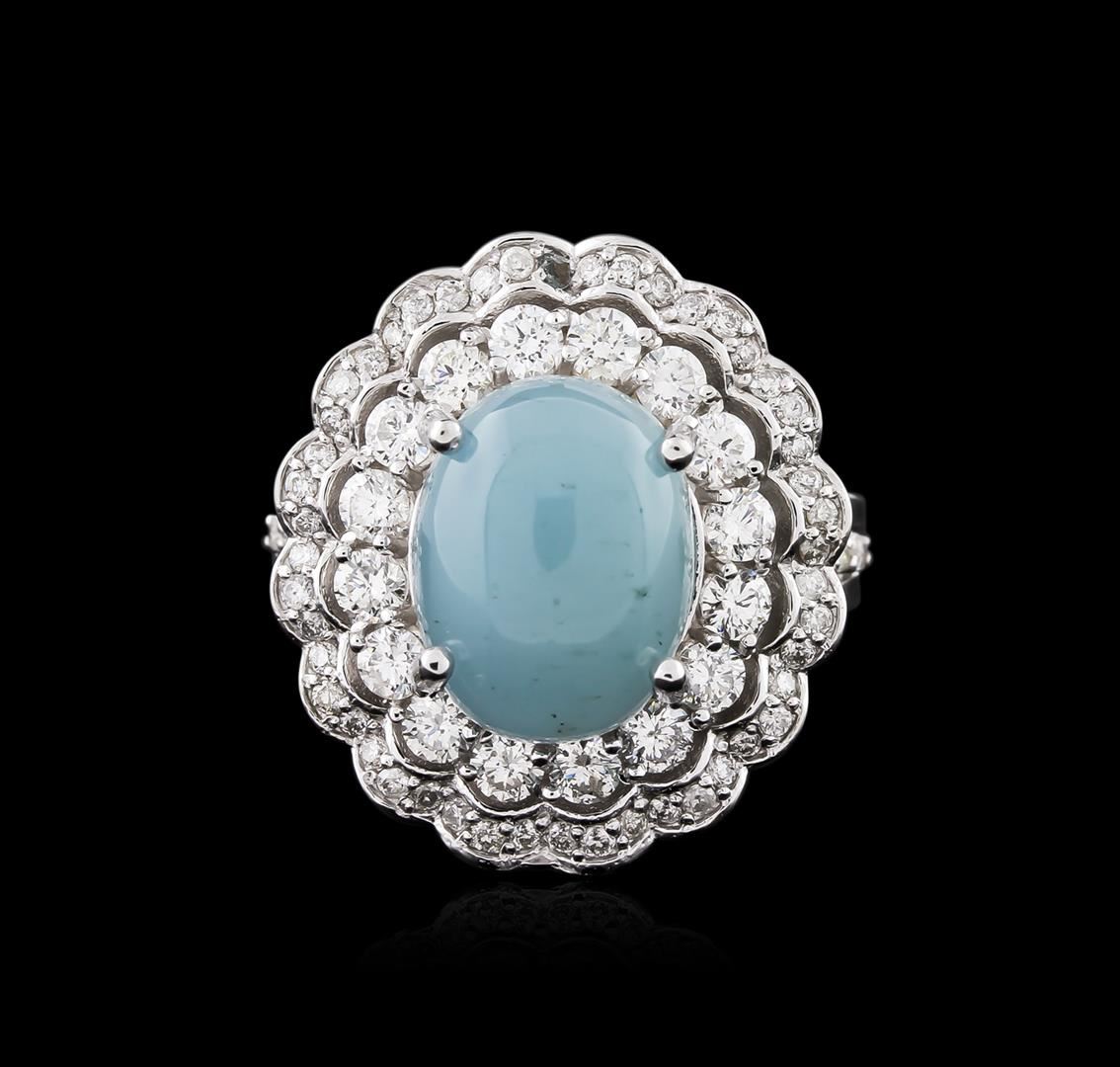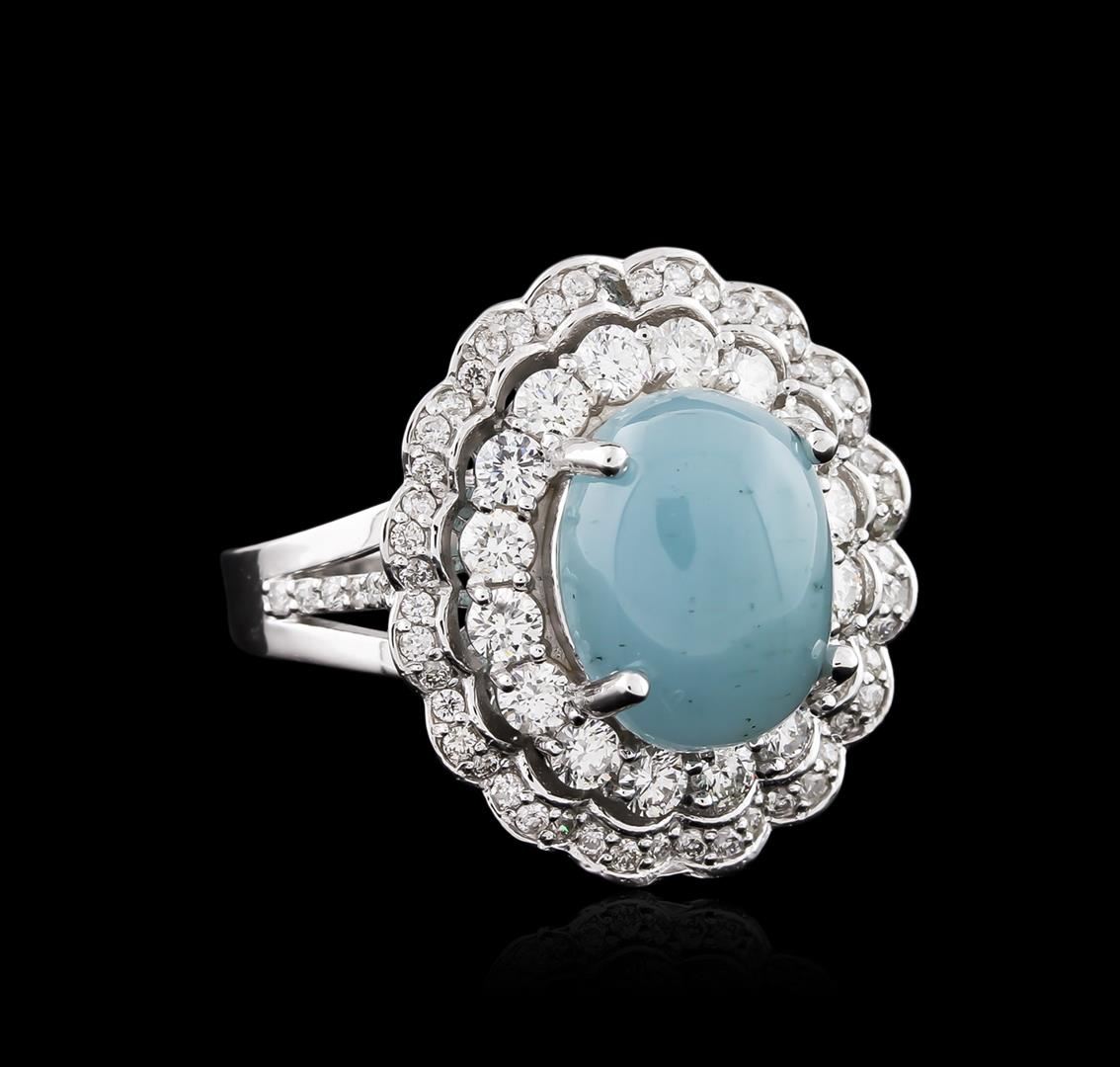 One electronically tested 14KT white gold ladies cast chalcedony and diamond ring with a bright polish finish. Identified with markings of "14K". Condition is new. Containing: One prong set oval cabochon cut natural chrysoprase, measuring 12.00. x 9.00. x 5.85mm, approximate weight of 4.44ct., clarity is heavily included, very light, very slightly grayish, blue color, (GIA B 2/3), cut is good. Thirty-Six prong set round brilliant cut diamonds, measuring 2.30 - 1.30 x 1.08mm (depth est.) approximate total weight of 36 Stones = 0.50ct. Clarity: SI-1 to I-1. Color: I - J, Cut is Good. Colored gemstones are presumed to have been subjected to commonly used enhancement processes. All diamonds and colored gemstones are graded in the mounting, unless otherwise stated. Total Weight of Colored Stones 4.44ct. Total Weight of Diamonds 0.50ct. Total Weight of Ring 8.80 grams. GGL Appraised at $3,840.00.