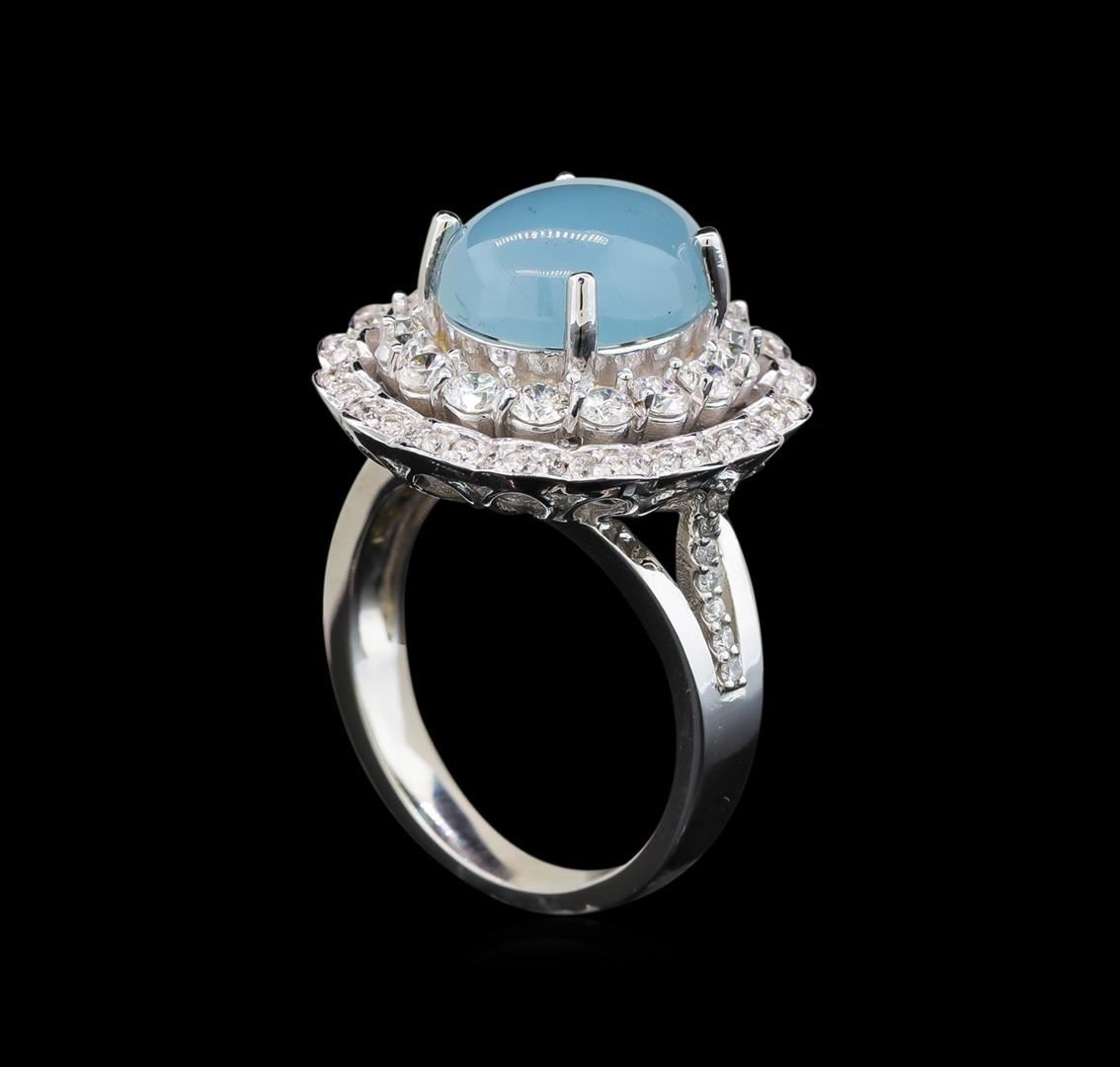 One electronically tested 14KT white gold ladies cast chalcedony and diamond ring with a bright polish finish. Identified with markings of "14K". Condition is new. Containing: One prong set oval cabochon cut natural chrysoprase, measuring 12.00. x 9.00. x 5.85mm, approximate weight of 4.44ct., clarity is heavily included, very light, very slightly grayish, blue color, (GIA B 2/3), cut is good. Thirty-Six prong set round brilliant cut diamonds, measuring 2.30 - 1.30 x 1.08mm (depth est.) approximate total weight of 36 Stones = 0.50ct. Clarity: SI-1 to I-1. Color: I - J, Cut is Good. Colored gemstones are presumed to have been subjected to commonly used enhancement processes. All diamonds and colored gemstones are graded in the mounting, unless otherwise stated. Total Weight of Colored Stones 4.44ct. Total Weight of Diamonds 0.50ct. Total Weight of Ring 8.80 grams. GGL Appraised at $3,840.00.