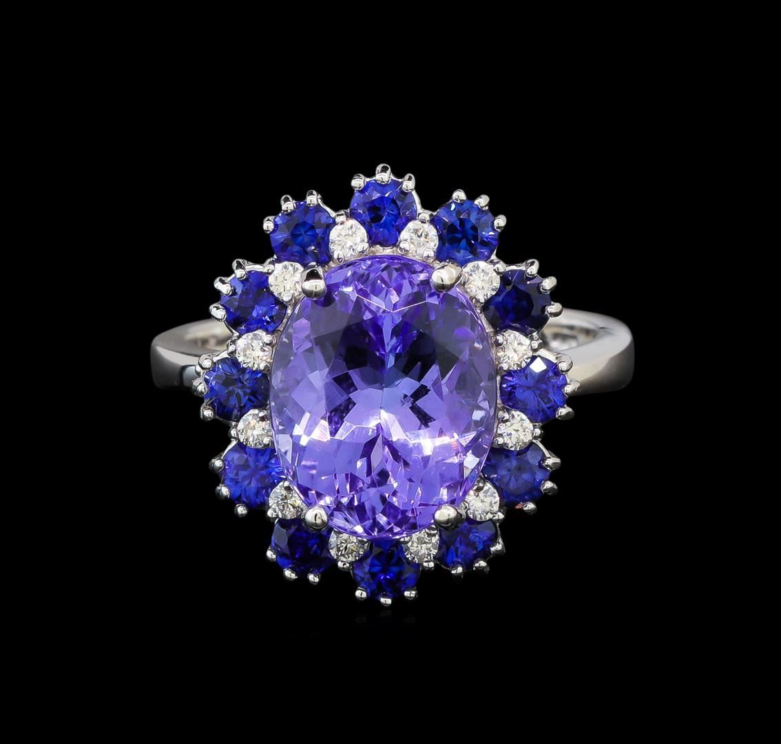 One electronically tested 14KT white gold ladies cast tanzanite, sapphire and diamond ring with a bright polish finish. Identified with markings of "K14". Condition is new. Containing: One prong set oval modified brilliant cut natural tanzanite, measuring 11.50 x 9.20 x 5.98mm, approximate weight of 4.45ct., clarity is eye clean, type I, light, very slightly grayish, violet color, (GIA V 3/3), cut is good. Twelve prong set round modified brilliant cut natural blue sapphires, measuring 2.90 - 2.90 x 1.89 mm, approximate total weight of 1.56ct., clarity is eye clean, type II, medium, moderately strong, blue color, (GIA B 5/4), cut is good. Twelve prong set round brilliant cut diamonds, measuring 1.30 - 1.30 x 0.78mm (depth est.) approximate total weight of 12 Stones = 0.10 ct. Clarity: SI-2 to I-1. Color: H - I, Cut is Good. Colored gemstones are presumed to have been subjected to commonly used enhancement processes. All diamonds and colored gemstones are graded in the mounting, unless otherwise stated. Total Weight of Colored Stones 6.01ct. Total Weight of Diamonds 0.10 ct. Total Weight of Ring 6.30 grams. GGL Appraised.