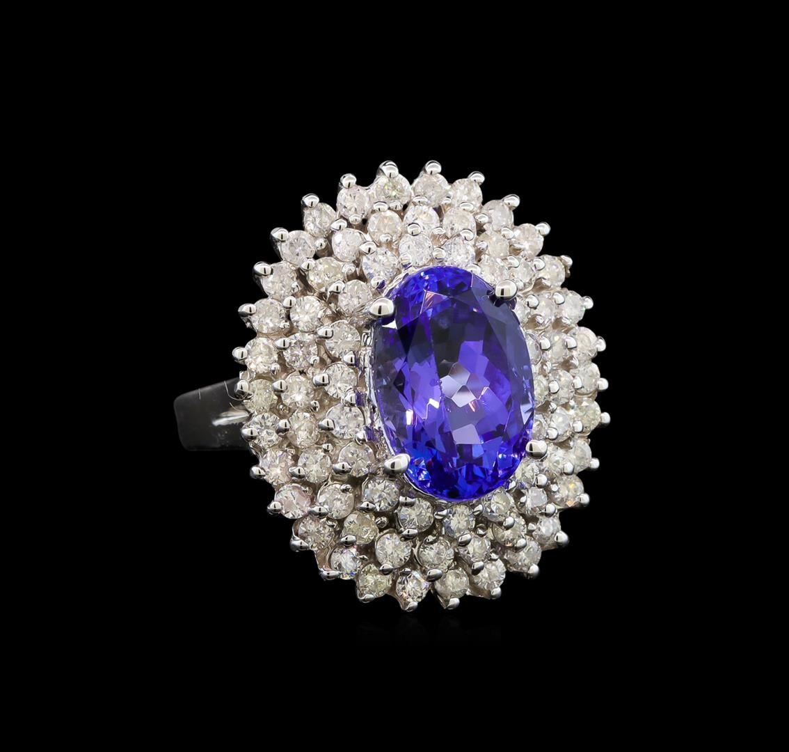 One electronically tested 14KT white gold ladies cast tanzanite and diamond ring with a split shank with a bright polish finish. Identified with markings of "K14". Condition is new. Containing: One prong set oval modified brilliant cut natural tanzanite, measuring 11.91 x 8.19 x 6.50mm, approximate weight of 4.46ct., clarity is eye clean, type I, medium light, very slightly grayish, bluish violet color, (GIA bV 4/3), cut is good. Seventy-Two prong set round brilliant cut diamonds, measuring 1.60 - 1.50 x 0.93mm (depth est.) approximate total weight of 72 Stones = 0.98ct. Clarity: I-1 to I-2. Color: I - J. All diamonds and colored gemstones are graded in the mounting, unless otherwise stated. Colored gemstones are presumed to have been subjected to commonly used enhancement processes. Total Weight of Colored Stones 4.46ct. Total Weight of Diamonds 0.98ct. Total Weight of Ring 9.70 grams. GGL Appraised at $7,315.00.