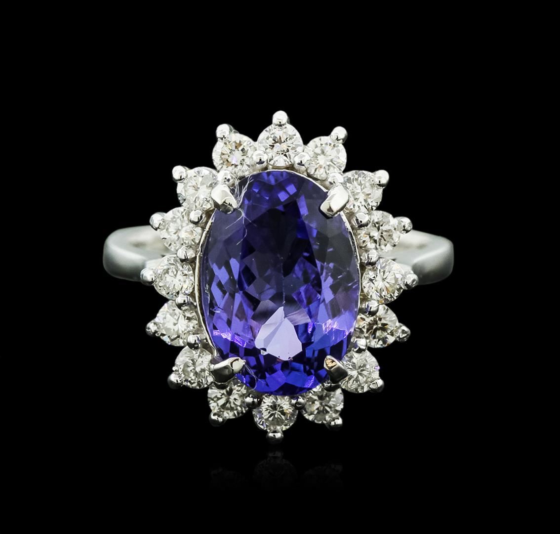One electronically tested 14KT white gold ladies cast tanzanite and diamond ring with a bright polish finish. Identified with markings of "14K". Condition is new. Containing: One prong set oval modified brilliant cut natural tanzanite, measuring 11.80 x 7.80 x 6.92mm, approximate weight of 4.48ct., clarity is eye clean, type I, medium light, slightly grayish, violet color, (GIA V 4/2), cut is good. Sixteen prong set round brilliant cut diamonds, measuring 2.30 - 2.30 x 1.38mm (depth est.) approximate total weight of 16 Stones = 0.71ct.. Clarity: SI-1 to SI-2. Color: I - J, Cut is Good. Colored gemstones are presumed to have been subjected to commonly used enhancement processes. All diamonds and colored gemstones are graded in the mounting, unless otherwise stated.. Total Weight of Colored Stones 4.48ct.. Total Weight of Diamonds 0.71ct.. Total Weight of Ring 5.10 grams. GGL Appraised at $5,420.00.