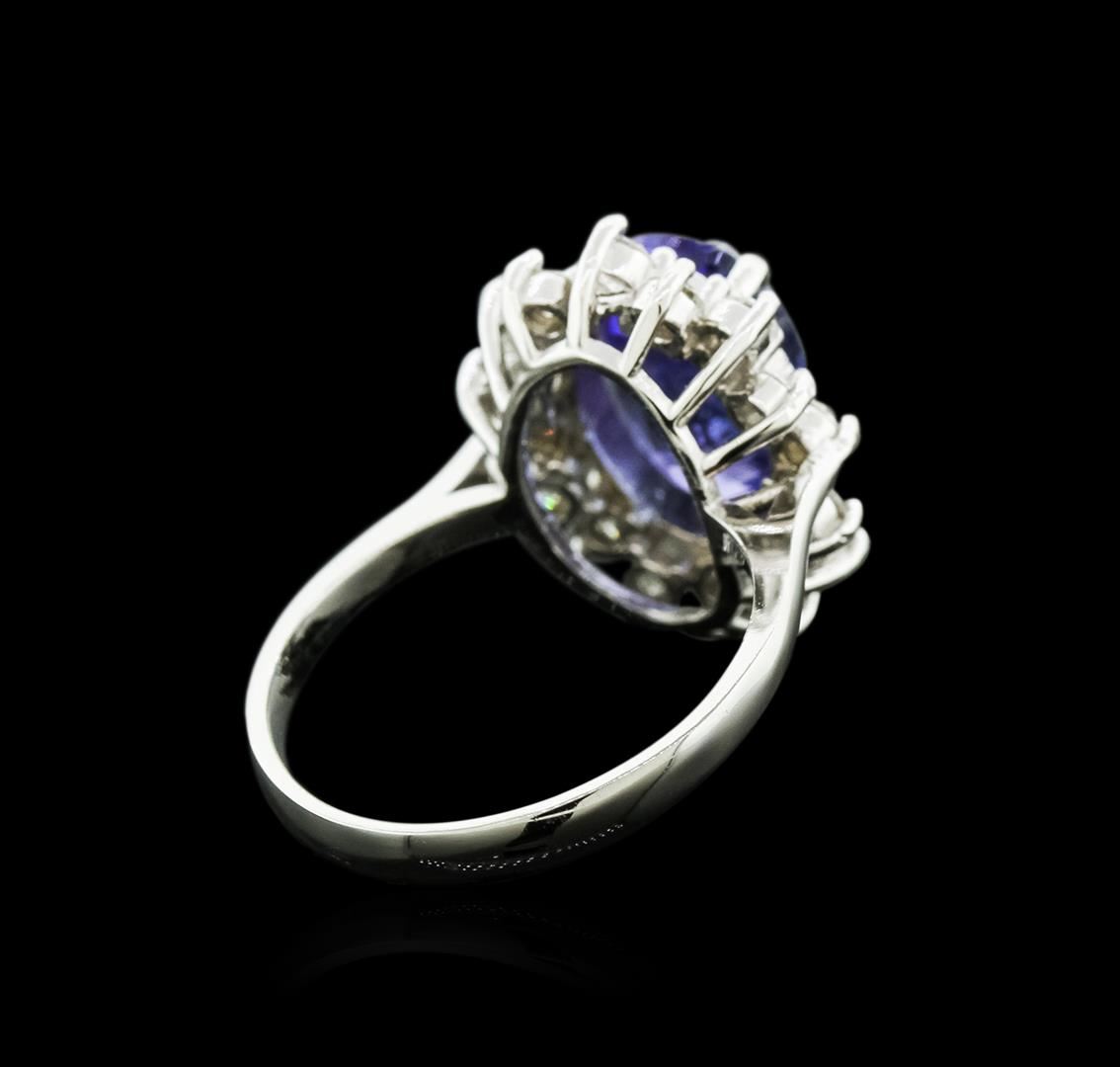 One electronically tested 14KT white gold ladies cast tanzanite and diamond ring with a bright polish finish. Identified with markings of "14K". Condition is new. Containing: One prong set oval modified brilliant cut natural tanzanite, measuring 11.80 x 7.80 x 6.92mm, approximate weight of 4.48ct., clarity is eye clean, type I, medium light, slightly grayish, violet color, (GIA V 4/2), cut is good. Sixteen prong set round brilliant cut diamonds, measuring 2.30 - 2.30 x 1.38mm (depth est.) approximate total weight of 16 Stones = 0.71ct.. Clarity: SI-1 to SI-2. Color: I - J, Cut is Good. Colored gemstones are presumed to have been subjected to commonly used enhancement processes. All diamonds and colored gemstones are graded in the mounting, unless otherwise stated.. Total Weight of Colored Stones 4.48ct.. Total Weight of Diamonds 0.71ct.. Total Weight of Ring 5.10 grams. GGL Appraised at $5,420.00.