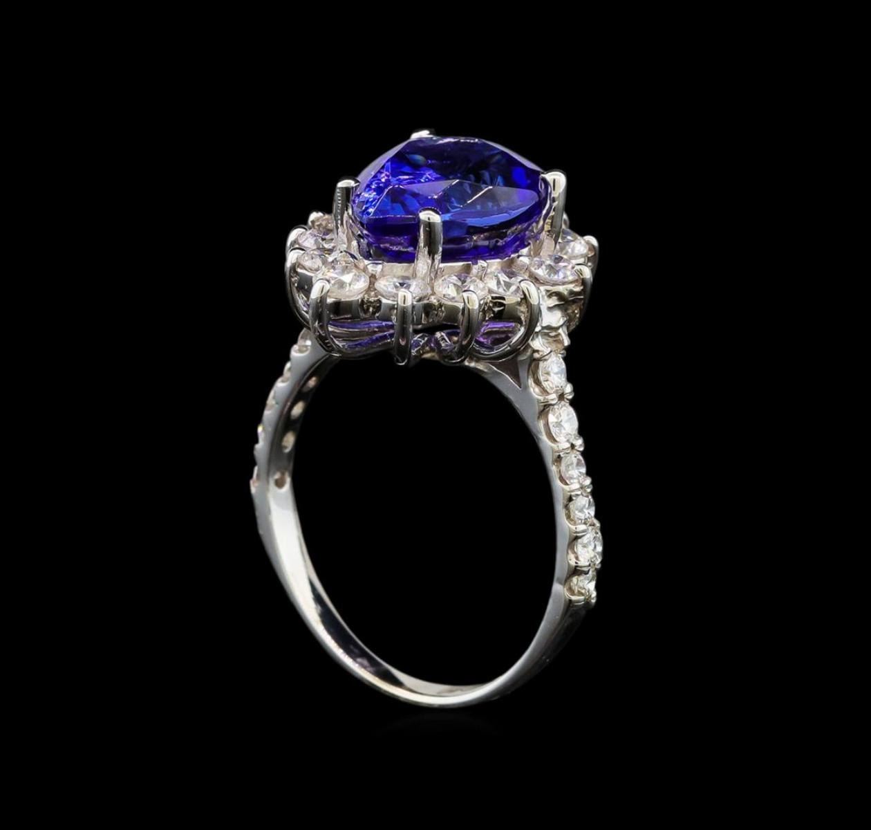 One electronically tested 14KT white gold ladies cast tanzanite and diamond ring with a bright polish finish. Identified with markings of "14K". Condition is new. Containing: One prong set pear modified brilliant cut natural tanzanite, measuring 11.52 x 8.88 x 6.53mm, approximate weight of 4.48ct., clarity is eye clean, type I, medium light, very slightly grayish, violet color, (GIA V 4/3), cut is good. Twenty-Five prong set round brilliant cut diamonds, measuring 2.50 - 2.00 x 1.35mm (depth est.) approximate total weight of 25 Stones = 1.04ct. Clarity: SI-2 to I-1. Color: I - J. Colored gemstones are presumed to have been subjected to commonly used enhancement processes. All diamonds and colored gemstones are graded in the mounting, unless otherwise stated. Total Weight of Colored Stones 4.48ct. Total Weight of Diamonds 1.04ct. Total Weight of Ring 4.90 grams. GGL Appraised at $6,195.00.
