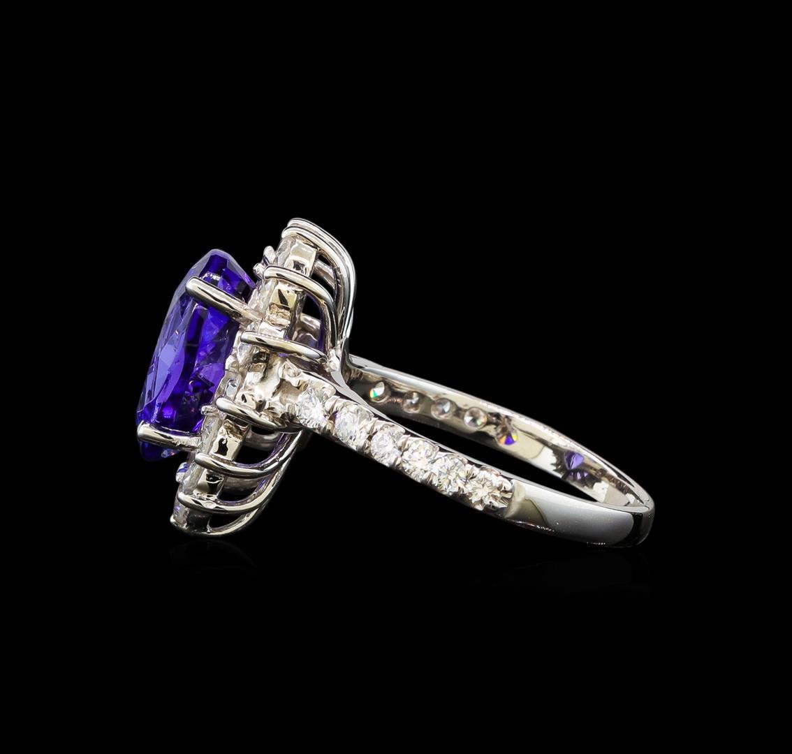 One electronically tested 14KT white gold ladies cast tanzanite and diamond ring with a bright polish finish. Identified with markings of "14K". Condition is new. Containing: One prong set pear modified brilliant cut natural tanzanite, measuring 11.52 x 8.88 x 6.53mm, approximate weight of 4.48ct., clarity is eye clean, type I, medium light, very slightly grayish, violet color, (GIA V 4/3), cut is good. Twenty-Five prong set round brilliant cut diamonds, measuring 2.50 - 2.00 x 1.35mm (depth est.) approximate total weight of 25 Stones = 1.04ct. Clarity: SI-2 to I-1. Color: I - J. Colored gemstones are presumed to have been subjected to commonly used enhancement processes. All diamonds and colored gemstones are graded in the mounting, unless otherwise stated. Total Weight of Colored Stones 4.48ct. Total Weight of Diamonds 1.04ct. Total Weight of Ring 4.90 grams. GGL Appraised.