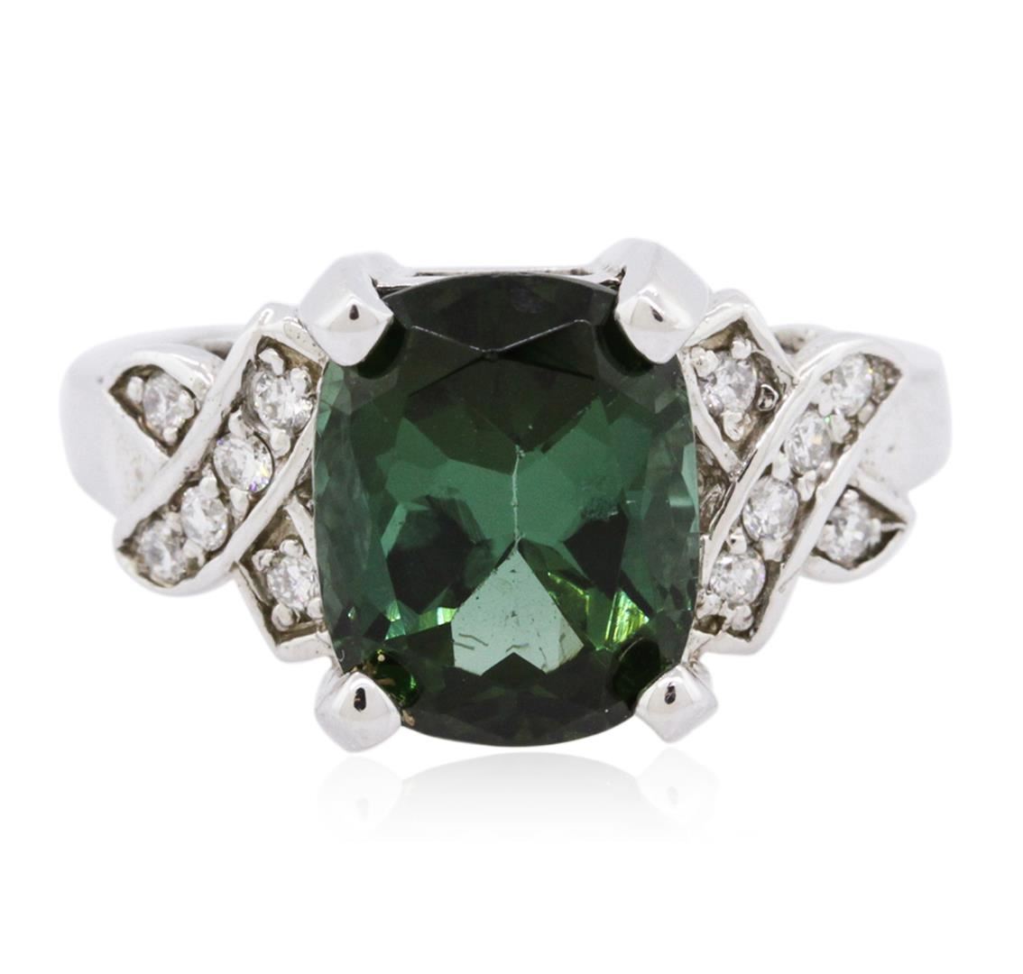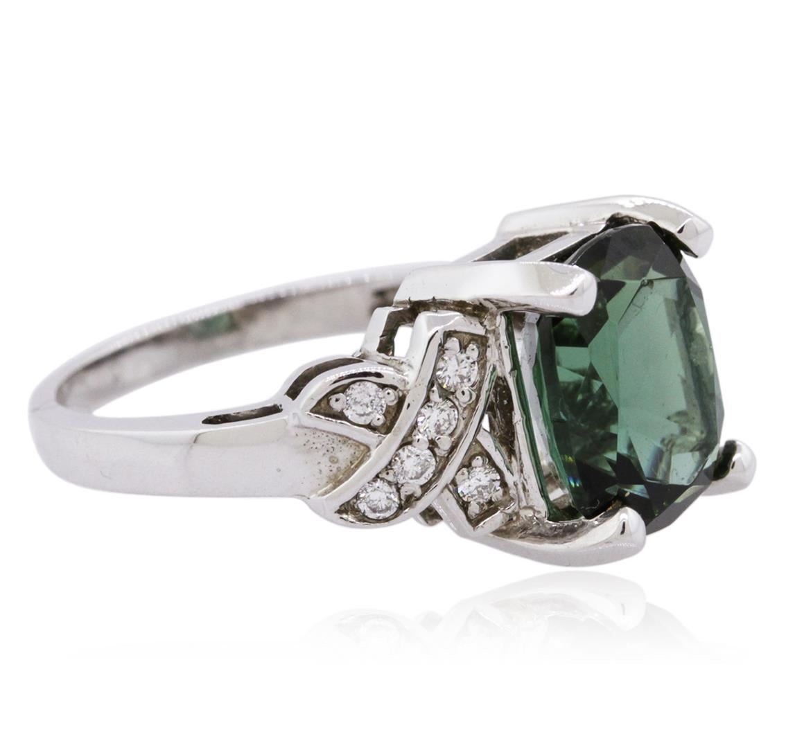 One electronically tested 14KT white gold ladies cast green tourmaline and diamond ring with a bright polish finish. The featured green tourmaline is supported by diamond set shoulders, completed by a two millimeter wide band. Identified with markings of "14K". Condition is new, good workmanship. Containing: One prong set rectangular cushion mixed cut natural green tourmaline, measuring 10.65 x 8.50 x 6.50mm, 6%. bulge factor, approximate weight of 4.49ct., clarity is slightly included, type I, dark, very slightly grayish, very slightly bluish green color, (GIA vslbG 7/3), cut is good. Transmitting light with a minimum of distortion, transparent. Naturally occurring internal & external characteristics are present. Graded in the setting. Twelve prong set round brilliant cut diamonds, measuring 1.60 - 1.50 x 0.93mm (depth est.) approximate total weight of 12 Stones = 0.25ct. Graded in the setting. Clarity: SI-1 to SI-2. Color: G - I. Total Weight of Colored Stones 4.49ct. Total Weight of Diamonds 0.25ct. Total Weight of Ring 5.27 grams. AIG Appraised at $2,530.00.