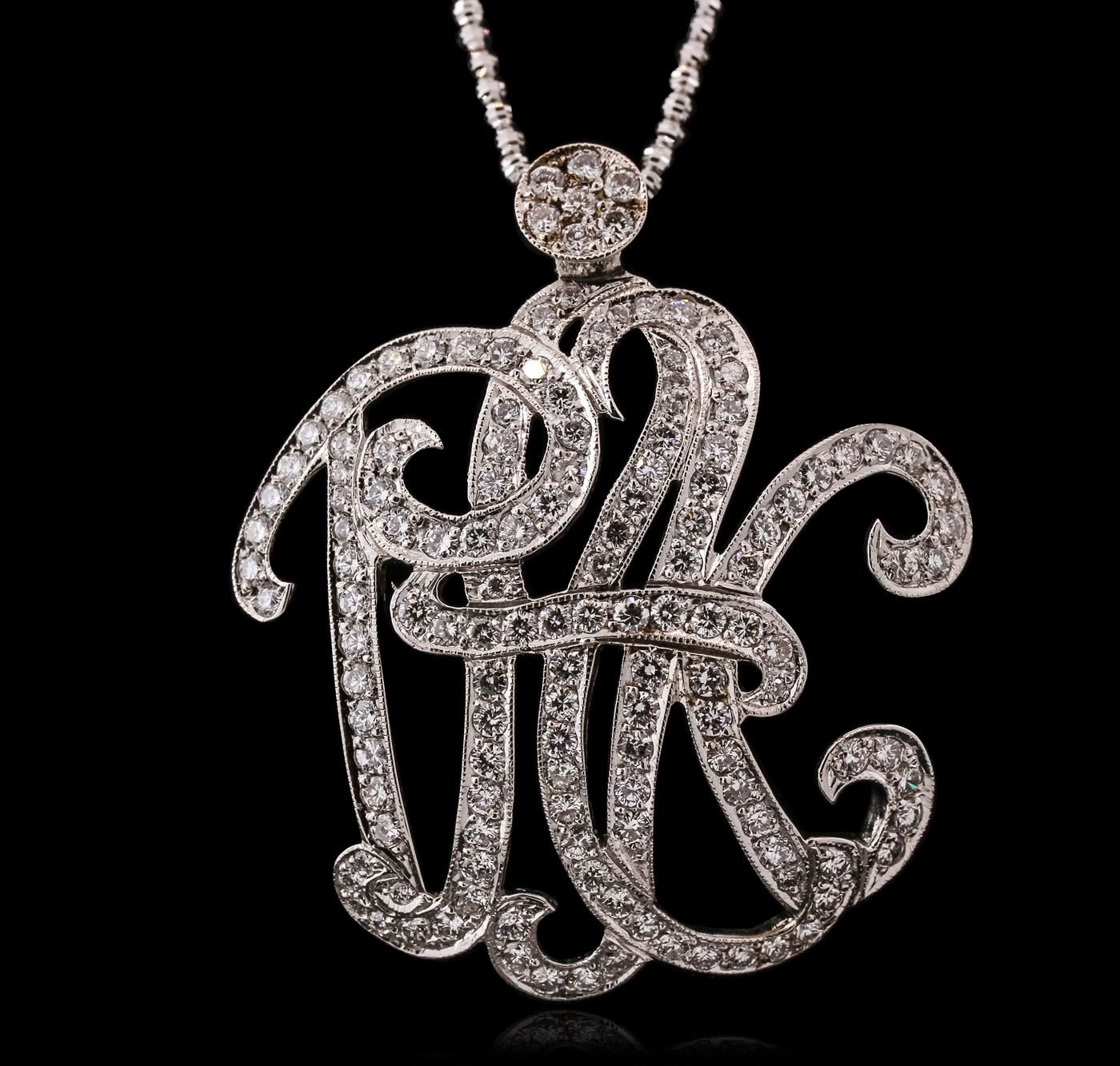 One electronically tested 14KT white gold ladies cast & assembled diamond monogram pendant with chain. The pendant features the work "PINK" in script lettering, completed by a diamond set bail. The pendant is supported by an eighteen inch length 14KT white gold designer style chain, terminating in a lobster claw clasp. Bright polish finish with milgrain detailing. Condition is good. Containing: One Hundred Forty-Three bead set round brilliant cut diamonds, measuring 2.10 - 1.95 x 1.22mm (depth est.) approximate total weight of 143 Stones = 4.50ct. Graded in the setting. Clarity: VS-1 to VS-2. Color: G - I. Total Weight of Diamonds 4.50ct. Total Weight of Monogram Pendant With Chain 18.94 grams. AIG Appraised at $19,430.00.