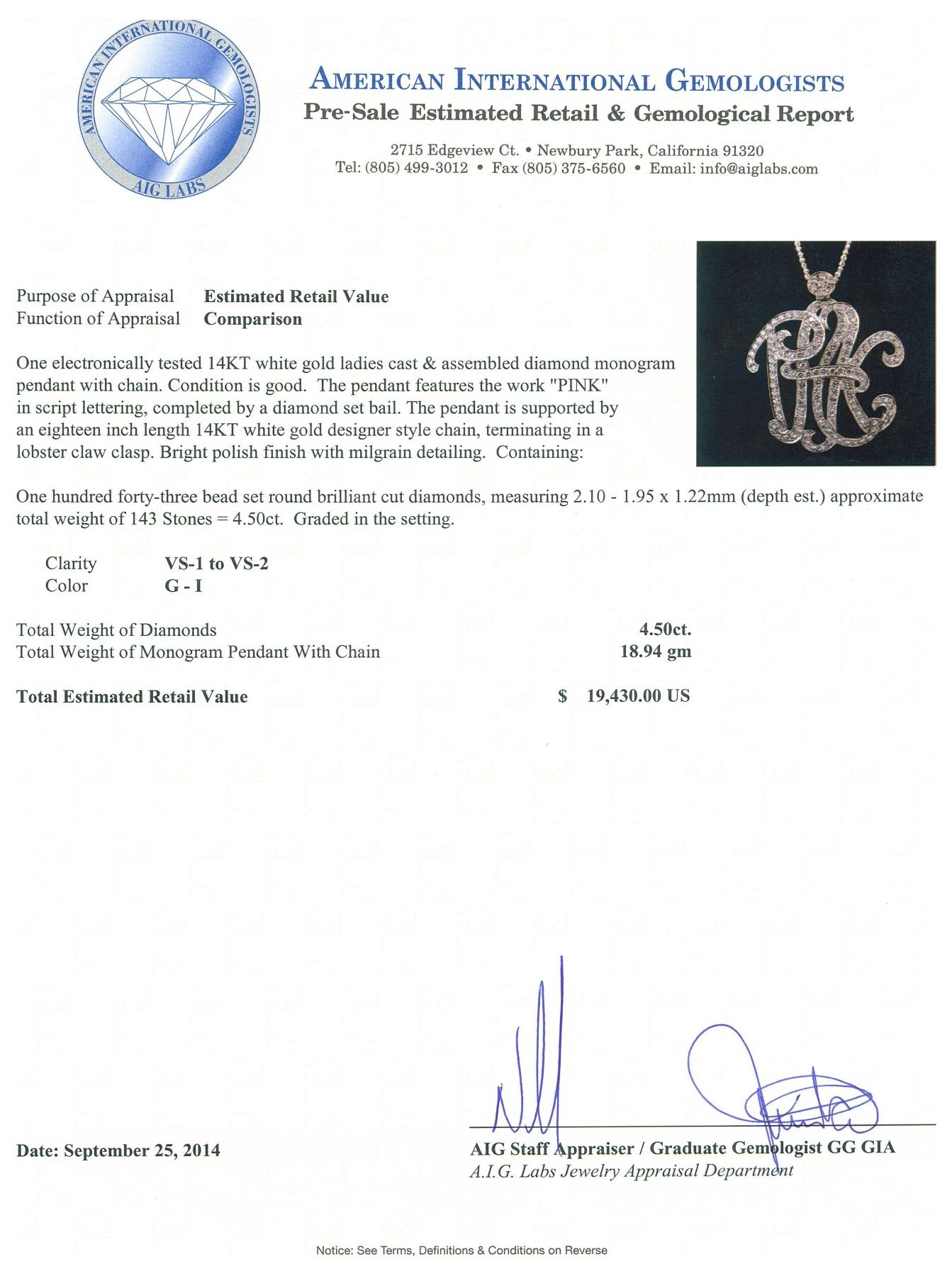 One electronically tested 14KT white gold ladies cast & assembled diamond monogram pendant with chain. The pendant features the work "PINK" in script lettering, completed by a diamond set bail. The pendant is supported by an eighteen inch length 14KT white gold designer style chain, terminating in a lobster claw clasp. Bright polish finish with milgrain detailing. Condition is good. Containing: One Hundred Forty-Three bead set round brilliant cut diamonds, measuring 2.10 - 1.95 x 1.22mm (depth est.) approximate total weight of 143 Stones = 4.50ct. Graded in the setting. Clarity: VS-1 to VS-2. Color: G - I. Total Weight of Diamonds 4.50ct. Total Weight of Monogram Pendant With Chain 18.94 grams. AIG Appraised.