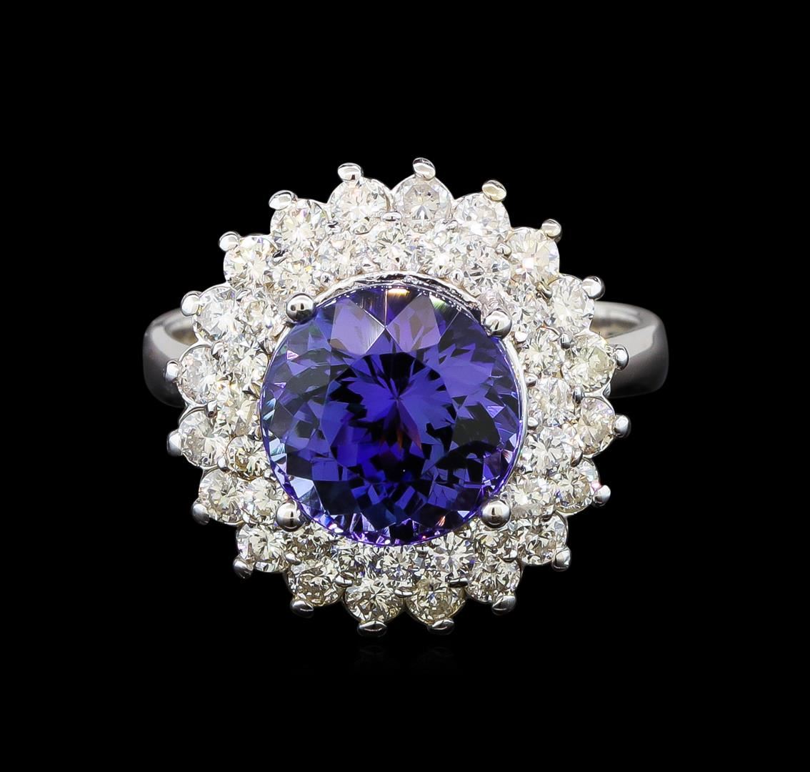 One electronically tested 14KT white gold ladies cast tanzanite and diamond ring with a bright polish finish. Identified with markings of "14K". Condition is new. Containing: One prong set round modified brilliant cut natural tanzanite, measuring 9.32 - 9.26 x 7.75 mm, approximate weight of 4.51ct., clarity is eye clean, type I, medium light, very slightly grayish, bluish violet color, (GIA bV 4/3), cut is good. Forty prong set round brilliant cut diamonds, measuring 2.00 - 1.80 x 1.14mm (depth est.) approximate total weight of 40 Stones = 1.00 ct. Clarity: SI-1 to SI-2. Color: I - J, Cut is Good. Colored gemstones are presumed to have been subjected to commonly used enhancement processes. All diamonds and colored gemstones are graded in the mounting, unless otherwise stated. Total Weight of Colored Stones 4.51ct. Total Weight of Diamonds 1.00 ct. Total Weight of Ring 6.70 grams. GGL Appraised.