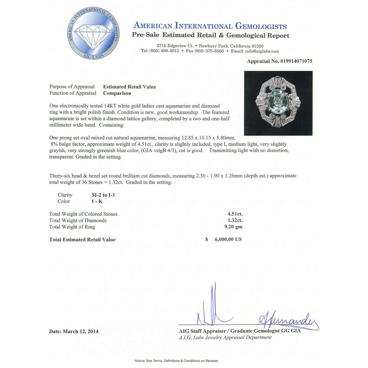 One electronically tested 14KT white gold ladies cast aquamarine and diamond ring with a bright polish finish. Condition is new, good workmanship. The featured aquamarine is set within a diamond lattice gallery, completed by a two and one-half millimeter wide band. Containing: One prong set oval mixed cut natural aquamarine, measuring 12.85 x 10.15 x 5.80mm, 8%. bulge factor, approximate weight of 4.51ct., clarity is slightly included, type I, medium light, very slightly grayish, very strongly greenish blue color, (GIA vstgB 4/3), cut is good. Transmitting light with no distortion, transparent. Graded in the setting. Thirty-Six bead & bezel set round brilliant cut diamonds, measuring 2.30 - 1.90 x 1.26mm (depth est.) approximate. Total Weight of 36 Stones = 1.32ct. Graded in the setting. Clarity: SI-2 to I-1. Color: I - K. Total Weight of Colored Stones 4.51ct. Total Weight of Diamonds 1.32ct. Total Weight of Ring 9.20 grams. AIG Appraised at $6,000.00.