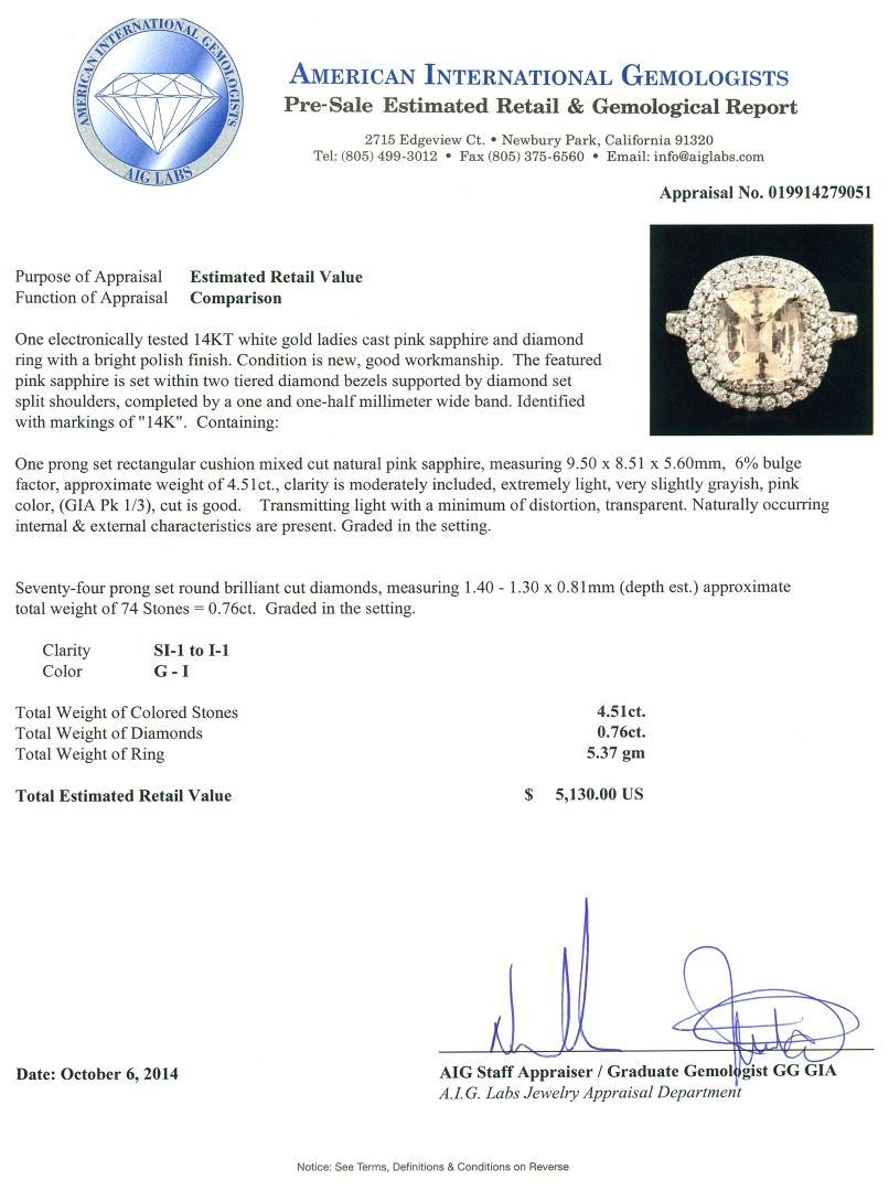 One electronically tested 14KT white gold ladies cast pink sapphire and diamond ring with a bright polish finish. The featured pink sapphire is set within two tiered diamond bezels supported by diamond set split shoulders, completed by a one and one-half millimeter wide band. Identified with markings of "14K". Condition is new, good workmanship. Containing: One prong set rectangular cushion mixed cut natural pink sapphire, measuring 9.50 x 8.51 x 5.60mm, 6%. bulge factor, approximate weight of 4.51ct., clarity is moderately included, extremely light, very slightly grayish, pink color, (GIA Pk 1/3), cut is good. Transmitting light with a minimum of distortion, transparent. Naturally occurring internal & external characteristics are present. Graded in the setting. Seventy-Four prong set round brilliant cut diamonds, measuring 1.40 - 1.30 x 0.81mm (depth est.) approximate. Total Weight of 74 Stones = 0.76ct. Graded in the setting. Clarity: SI-1 to I-1. Color: G - I. Total Weight of Colored Stones 4.51ct. Total Weight of Diamonds 0.76ct. Total Weight of Ring 5.37gm. AIG Appraised at $5,130.00.