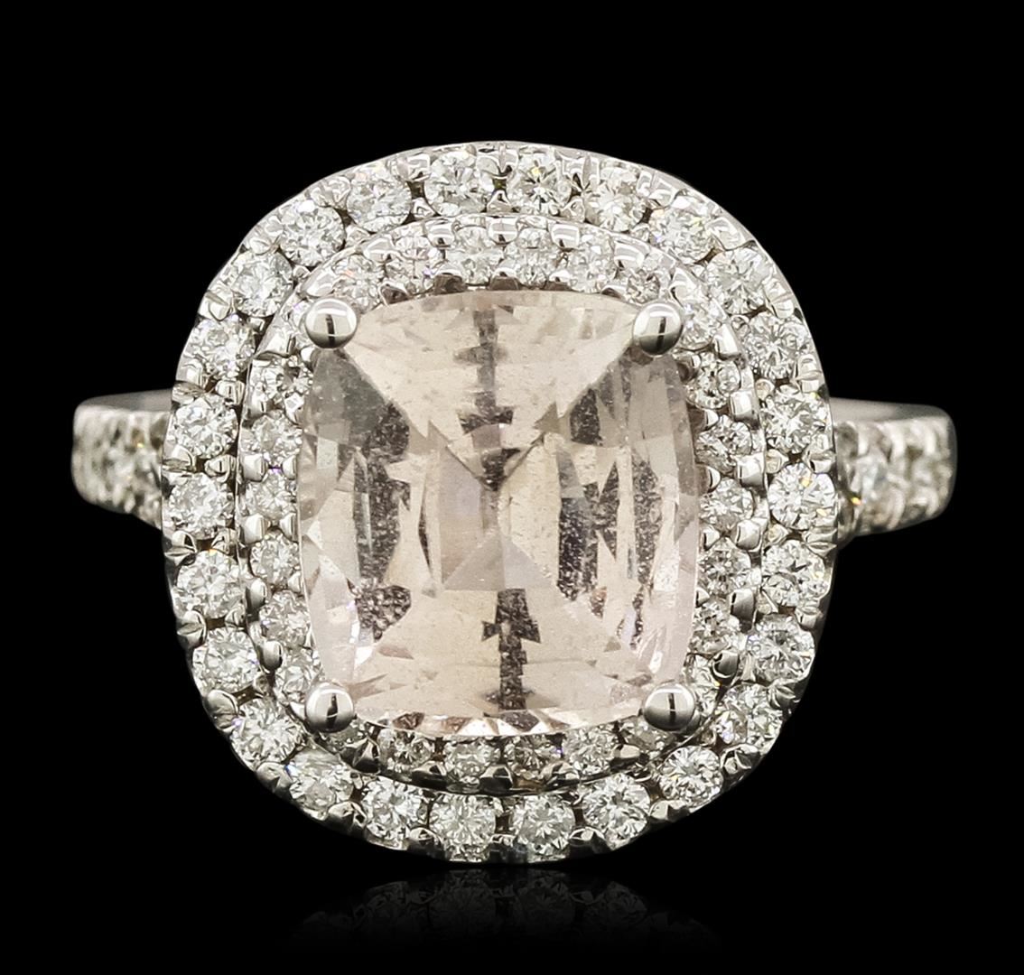 One electronically tested 14KT white gold ladies cast pink sapphire and diamond ring with a bright polish finish. The featured pink sapphire is set within two tiered diamond bezels supported by diamond set split shoulders, completed by a one and one-half millimeter wide band. Identified with markings of "14K". Condition is new, good workmanship. Containing: One prong set rectangular cushion mixed cut natural pink sapphire, measuring 9.50 x 8.51 x 5.60mm, 6%. bulge factor, approximate weight of 4.51ct., clarity is moderately included, extremely light, very slightly grayish, pink color, (GIA Pk 1/3), cut is good. Transmitting light with a minimum of distortion, transparent. Naturally occurring internal & external characteristics are present. Graded in the setting. Seventy-Four prong set round brilliant cut diamonds, measuring 1.40 - 1.30 x 0.81mm (depth est.) approximate. Total Weight of 74 Stones = 0.76ct. Graded in the setting. Clarity: SI-1 to I-1. Color: G - I. Total Weight of Colored Stones 4.51ct. Total Weight of Diamonds 0.76ct. Total Weight of Ring 5.37gm. AIG Appraised at $5,130.00.