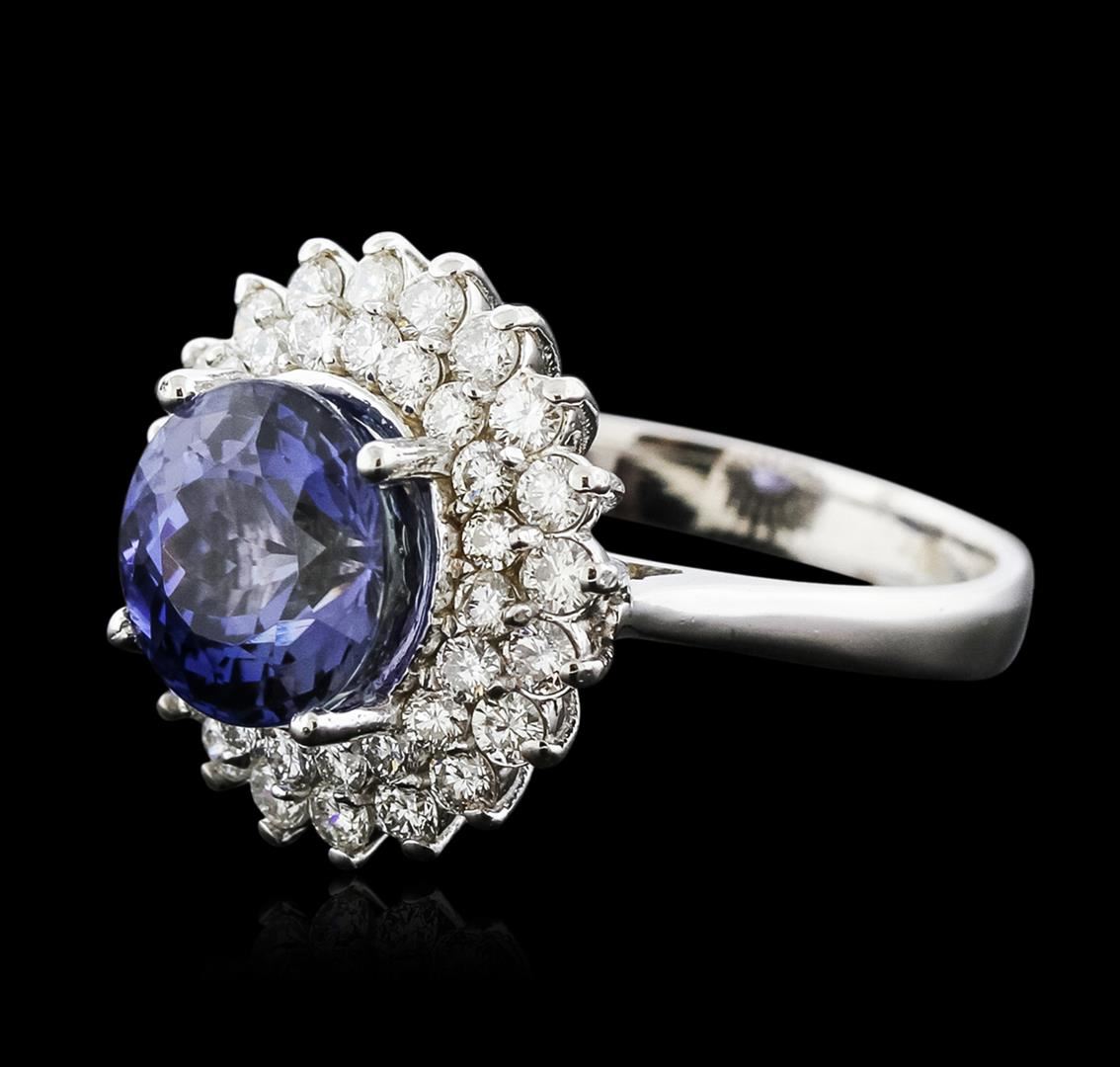 One electronically tested 14KT white gold ladies cast tanzanite and diamond ring with a bright polish finish. Identified with markings of "14K". Condition is new. Containing: One prong set round modified brilliant cut natural tanzanite, measuring 9.32 - 9.26 x 7.75 mm, approximate weight of 4.51ct., clarity is eye clean, type I, medium light, very slightly grayish, bluish violet color, (GIA bV 4/3), cut is good. Forty prong set round brilliant cut diamonds, measuring 2.00 - 1.80 x 1.14mm (depth est.) approximate total weight of 40 Stones = 1.00ct. Clarity: SI-1 to SI-2. Color: I - J, Cut is Good. Colored gemstones are presumed to have been subjected to commonly used enhancement processes. All diamonds and colored gemstones are graded in the mounting, unless otherwise stated. Total Weight of Colored Stones 4.51ct. Total Weight of Diamonds 1.00ct. Total Weight of Ring 6.70 grams. GGL Appraised at $5,520.00.