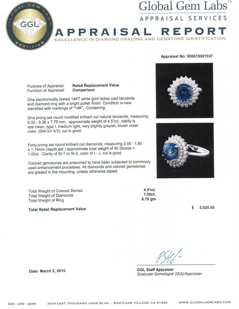 One electronically tested 14KT white gold ladies cast tanzanite and diamond ring with a bright polish finish. Identified with markings of "14K". Condition is new. Containing: One prong set round modified brilliant cut natural tanzanite, measuring 9.32 - 9.26 x 7.75 mm, approximate weight of 4.51ct., clarity is eye clean, type I, medium light, very slightly grayish, bluish violet color, (GIA bV 4/3), cut is good. Forty prong set round brilliant cut diamonds, measuring 2.00 - 1.80 x 1.14mm (depth est.) approximate total weight of 40 Stones = 1.00ct. Clarity: SI-1 to SI-2. Color: I - J, Cut is Good. Colored gemstones are presumed to have been subjected to commonly used enhancement processes. All diamonds and colored gemstones are graded in the mounting, unless otherwise stated. Total Weight of Colored Stones 4.51ct. Total Weight of Diamonds 1.00ct. Total Weight of Ring 6.70 grams. GGL Appraised at $5,520.00.