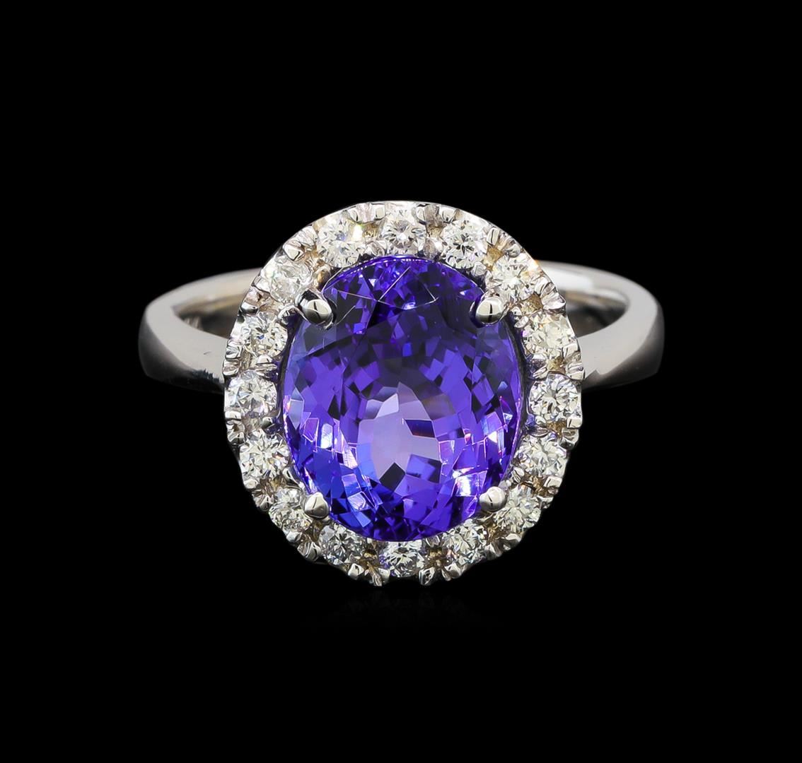 One electronically tested 14KT white gold ladies cast tanzanite and diamond ring with a bright polish finish. Identified with markings of "K14". Condition is new. Containing: One prong set oval modified brilliant cut natural tanzanite, measuring 10.90 x 8.80 x 6.70mm, approximate weight of 4.52ct., clarity is eye clean, type I, medium light, very slightly grayish, violet color, (GIA V 4/3), cut is good. Sixteen prong set round brilliant cut diamonds, measuring 1.50 - 1.50 x 0.90mm (depth est.) approximate total weight of 16 Stones = 0.20ct. Clarity: SI-1 to SI-2. Color: H - I, Cut is Good. Colored gemstones are presumed to have been subjected to commonly used enhancement processes. All diamonds and colored gemstones are graded in the mounting, unless otherwise stated. Total Weight of Colored Stones 4.52ct. Total Weight of Diamonds 0.20ct. Total Weight of Ring 5.60 grams. GGL Appraised at $3,985.00.