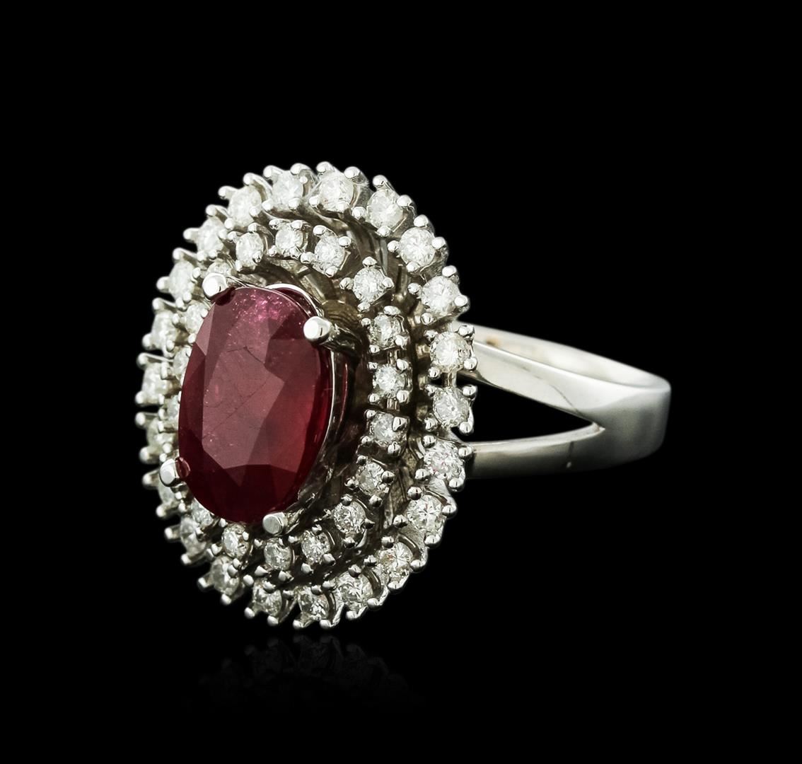 One electronically tested 14KT white gold ladies cast ruby and diamond ring with a bright polish finish. Identified with markings of "K14". Condition is new. Containing: One prong set oval modified brilliant cut natural ruby, measuring 11.84 x 7.90 x 5.69mm, approximate weight of 4.53ct., clarity is heavily included, type II, medium dark, very slightly brownish, strongly purplish red color, (GIA stpR 6/3), cut is good. Forty prong set round brilliant cut diamonds, measuring 1.90 - 1.50 x 1.02mm (depth est.) approximate total weight of 40 Stones = 0.72ct. Clarity: SI-1 to SI-2. Color: I - J, Cut is Good. Colored gemstones are presumed to have been subjected to commonly used enhancement processes. All diamonds and colored gemstones are graded in the mounting, unless otherwise stated. Total Weight of Colored Stones 4.53ct. Total Weight of Diamonds 0.72ct. Total Weight of Ring 12.70 grams. GGL Appraised at $4,220.00.