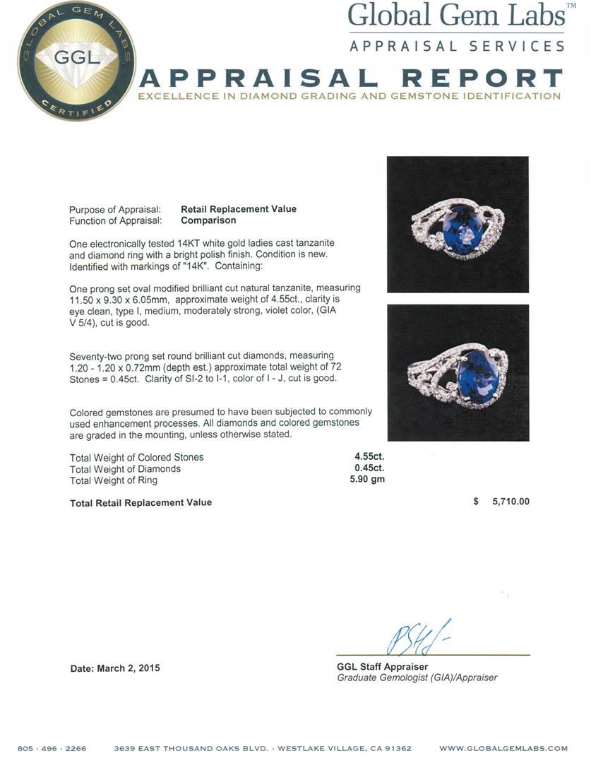 One electronically tested 14KT white gold ladies cast tanzanite and diamond ring with a bright polish finish. Identified with markings of "14K". Condition is new. Containing: One prong set oval modified brilliant cut natural tanzanite, measuring 11.50 x 9.30 x 6.05mm, approximate weight of 4.55ct., clarity is eye clean, type I, medium, moderately strong, violet color, (GIA V 5/4), cut is good. Seventy-Two prong set round brilliant cut diamonds, measuring 1.20 - 1.20 x 0.72mm (depth est.) approximate total weight of 72 Stones = 0.45ct. Clarity: SI-2 to I-1. Color: I - J, Cut is Good. Colored gemstones are presumed to have been subjected to commonly used enhancement processes. All diamonds and colored gemstones are graded in the mounting, unless otherwise stated. Total Weight of Colored Stones 4.55ct. Total Weight of Diamonds 0.45ct. Total Weight of Ring 5.90 grams. GGL Appraised at $5,710.00.