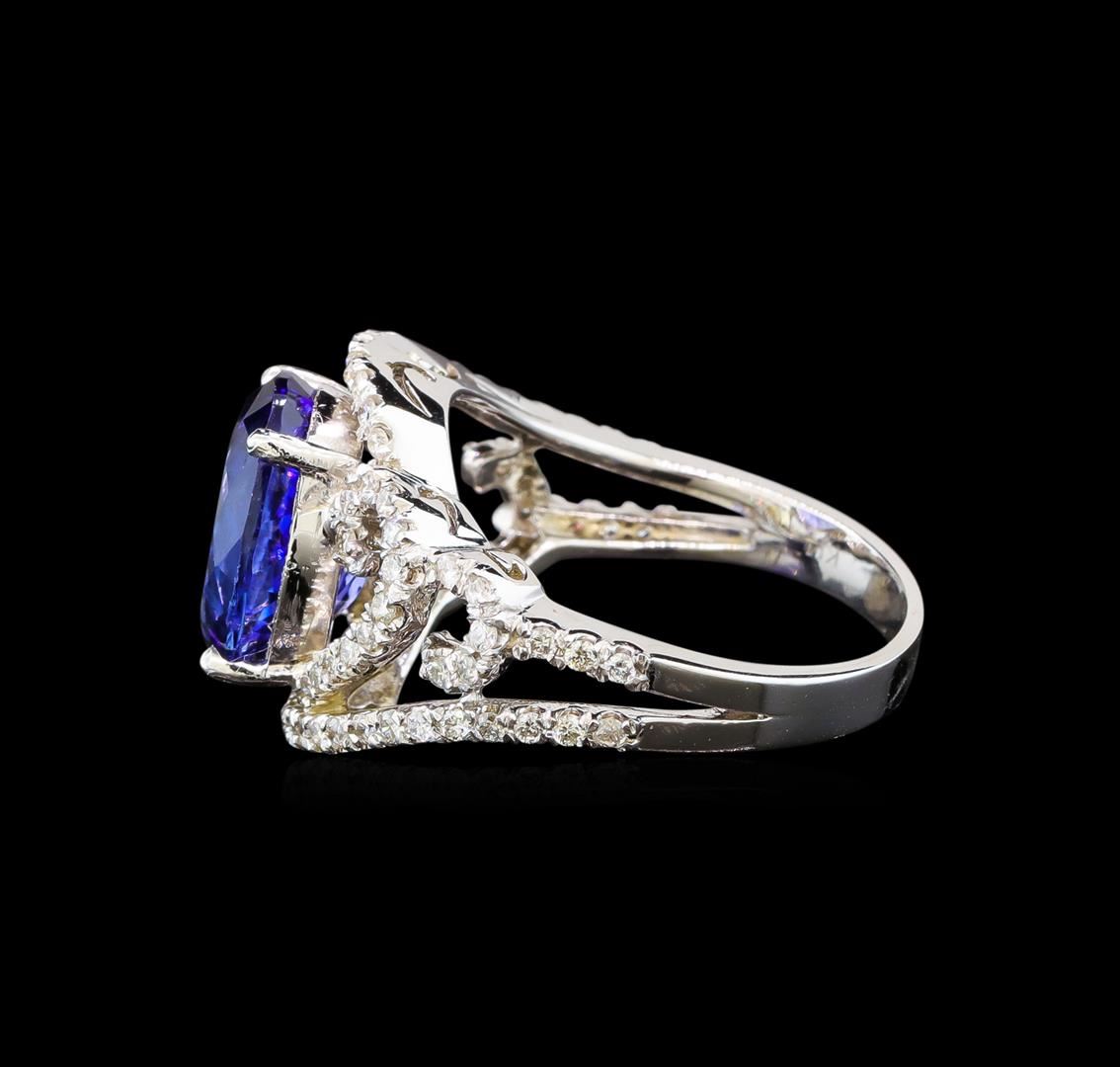 One electronically tested 14KT white gold ladies cast tanzanite and diamond ring with a bright polish finish. Identified with markings of "14K". Condition is new. Containing: One prong set oval modified brilliant cut natural tanzanite, measuring 11.50 x 9.30 x 6.05mm, approximate weight of 4.55ct., clarity is eye clean, type I, medium, moderately strong, violet color, (GIA V 5/4), cut is good. Seventy-Two prong set round brilliant cut diamonds, measuring 1.20 - 1.20 x 0.72mm (depth est.) approximate total weight of 72 Stones = 0.45ct. Clarity: SI-2 to I-1. Color: I - J, Cut is Good. Colored gemstones are presumed to have been subjected to commonly used enhancement processes. All diamonds and colored gemstones are graded in the mounting, unless otherwise stated. Total Weight of Colored Stones 4.55ct. Total Weight of Diamonds 0.45ct. Total Weight of Ring 5.90 grams. GGL Appraised.