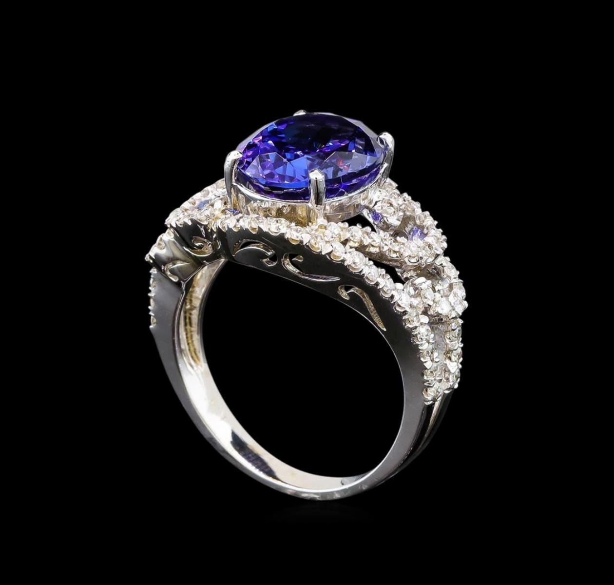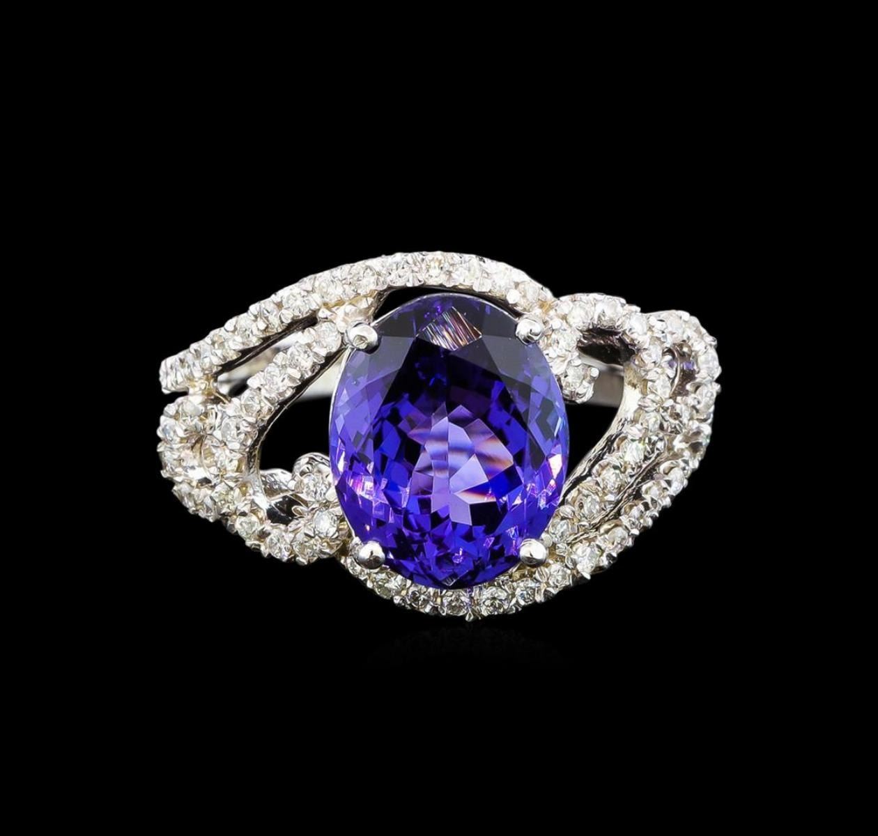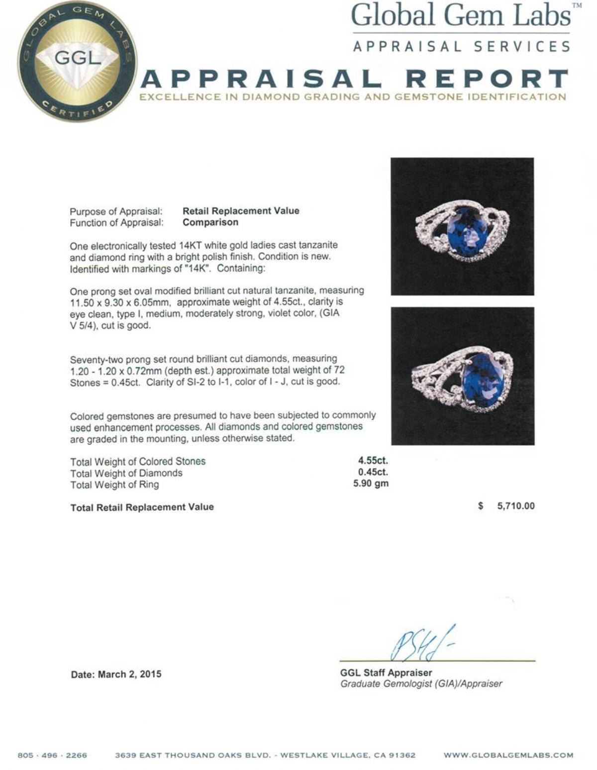 One electronically tested 14KT white gold ladies cast tanzanite and diamond ring with a bright polish finish. Identified with markings of "14K". Condition is new. Containing: One prong set oval modified brilliant cut natural tanzanite, measuring 11.50 x 9.30 x 6.05mm, approximate weight of 4.55ct., clarity is eye clean, type I, medium, moderately strong, violet color, (GIA V 5/4), cut is good. Seventy-Two prong set round brilliant cut diamonds, measuring 1.20 - 1.20 x 0.72mm (depth est.) approximate total weight of 72 Stones = 0.45ct. Clarity: SI-2 to I-1. Color: I - J, Cut is Good. Colored gemstones are presumed to have been subjected to commonly used enhancement processes. All diamonds and colored gemstones are graded in the mounting, unless otherwise stated. Total Weight of Colored Stones 4.55ct. Total Weight of Diamonds 0.45ct. Total Weight of Ring 5.90 grams. GGL Appraised.