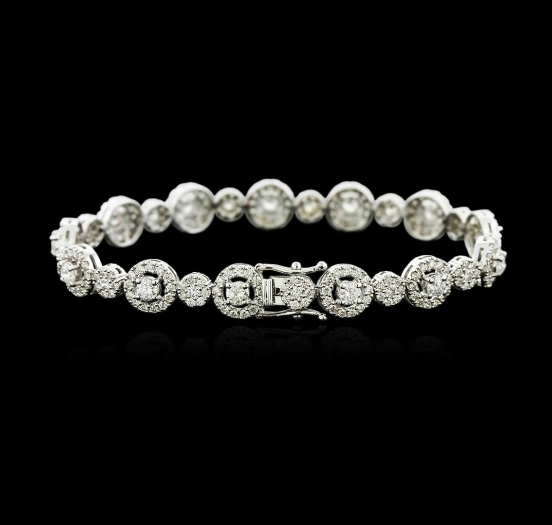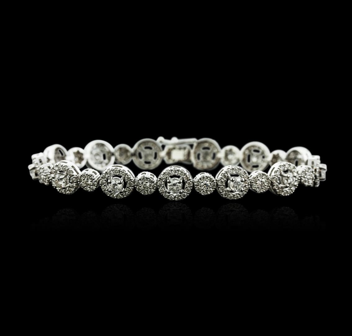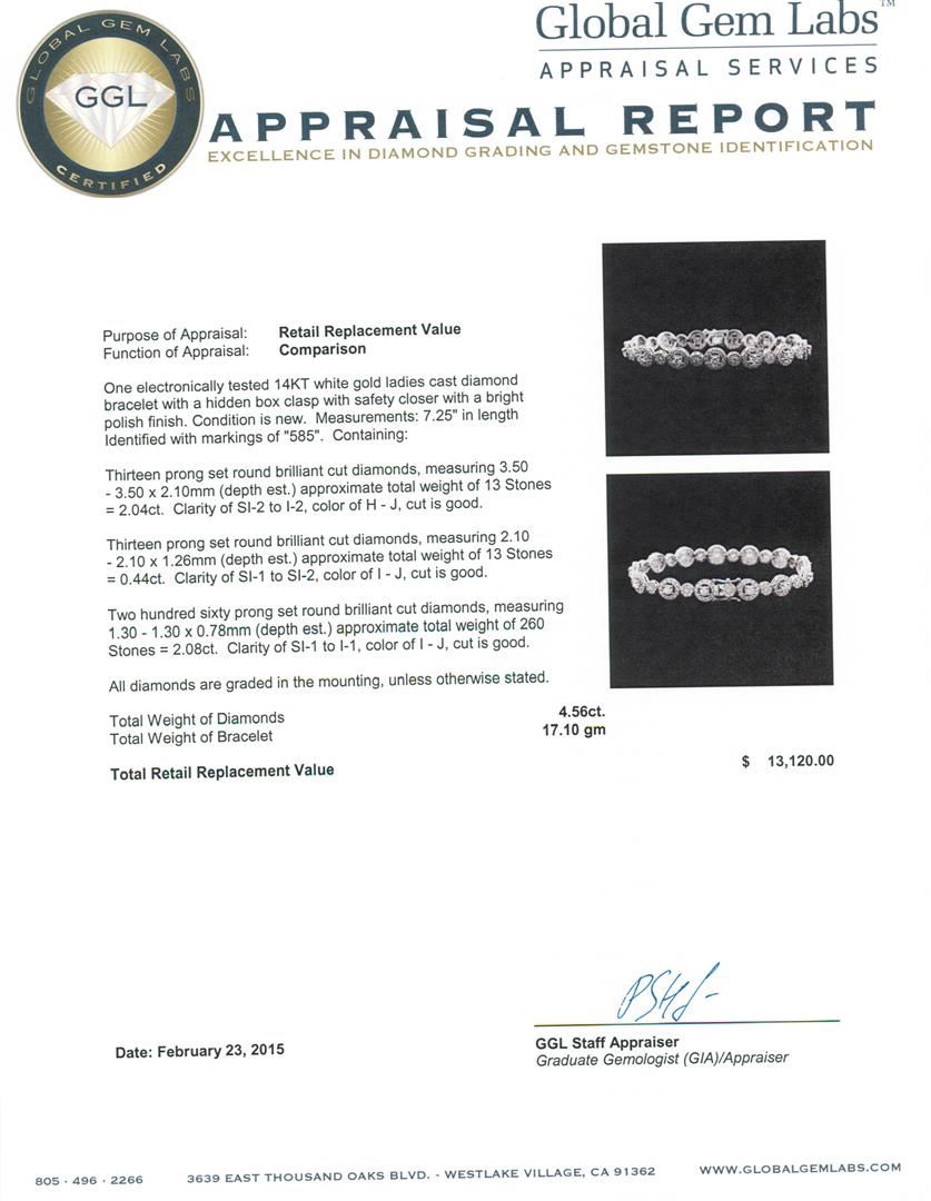 One electronically tested 14KT white gold ladies cast diamond bracelet with a hidden box clasp with safety closer with a bright polish finish. Measurements: 7.25" in length Identified with markings of "585". Condition is new. Containing: Thirteen prong set round brilliant cut diamonds, measuring 3.50 - 3.50 x 2.10mm (depth est.) approximate total weight of 13 Stones = 2.04ct. Clarity: SI-2 to I-2. Color: H - J, Cut is Good. Thirteen prong set round brilliant cut diamonds, measuring 2.10 - 2.10 x 1.26mm (depth est.) approximate total weight of 13 Stones = 0.44ct. Clarity: SI-1 to SI-2. Color: I - J, Cut is Good. Two Hundred Sixty prong set round brilliant cut diamonds, measuring 1.30 - 1.30 x 0.78mm (depth est.) approximate total weight of 260 Stones = 2.08ct. Clarity: SI-1 to I-1. Color: I - J, Cut is Good. All diamonds are graded in the mounting, unless otherwise stated. Total Weight of Diamonds 4.56ct. Total Weight of Bracelet 17.10 grams. GGL Appraised at $13,120.00.