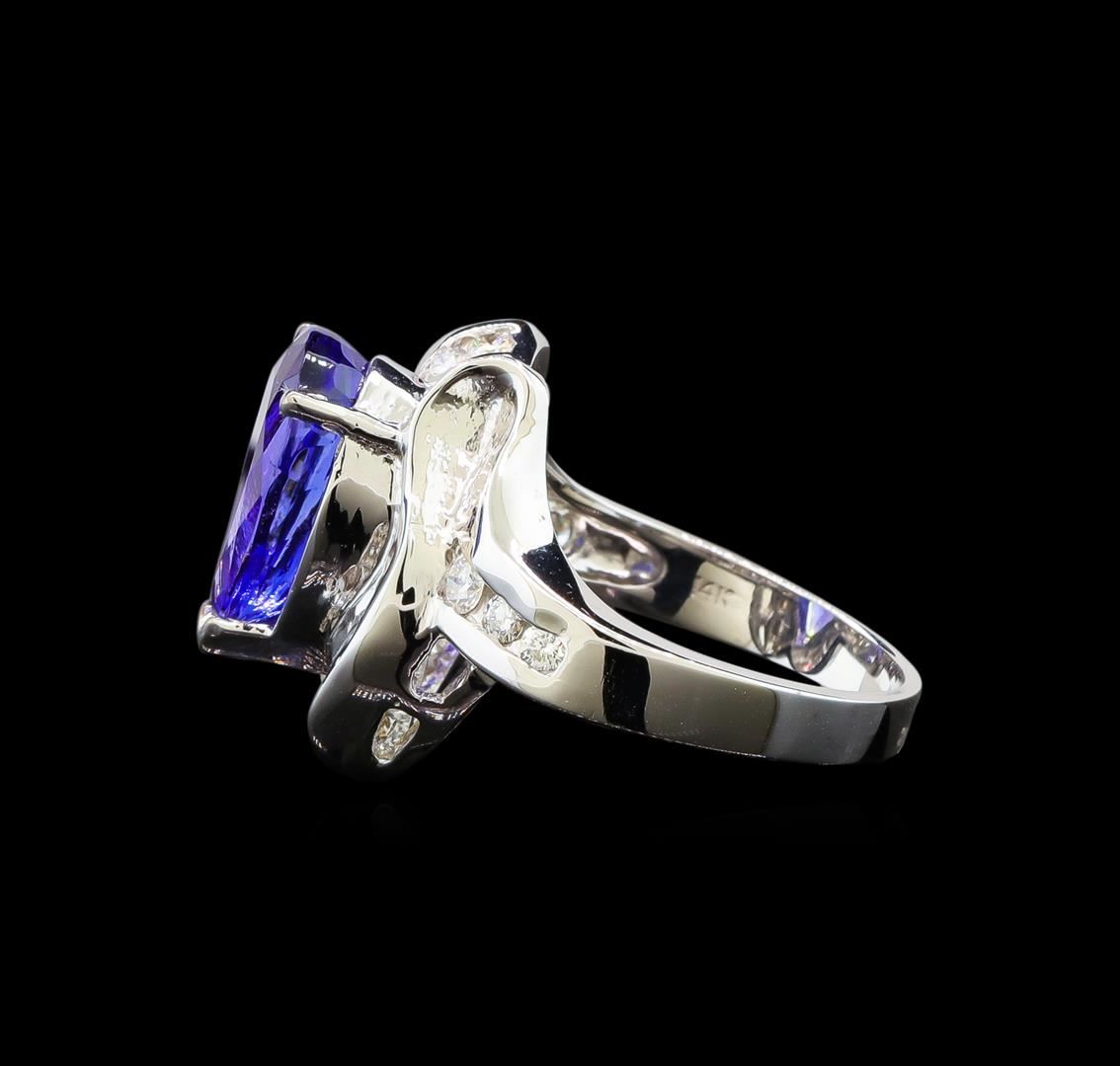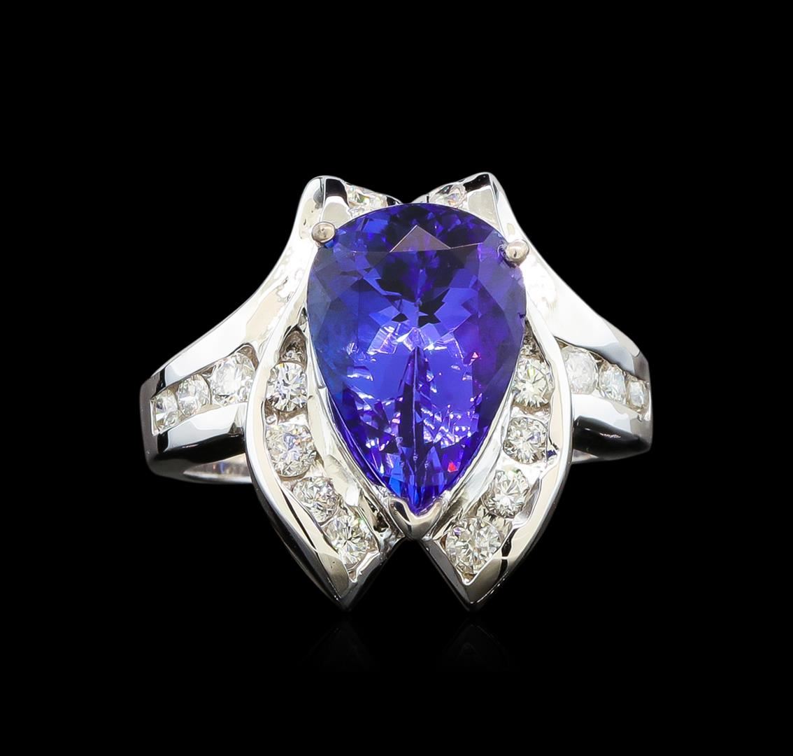 One electronically tested 14KT white gold ladies cast tanzanite and diamond ring with a bright polish finish. Identified with markings of "14K". Condition is new. Containing: One prong set pear modified brilliant cut natural tanzanite, measuring 13.00. x 8.80 x 6.40mm, approximate weight of 4.58ct., clarity is eye clean, type I, medium, moderately strong, bluish violet color, (GIA bV 5/4), cut is good. The stone has been heat treated to improve the color. Eighteen prong set round brilliant cut diamonds, measuring 2.30 - 1.80 x 1.23mm (depth est.) approximate total weight of 18 Stones = 0.58ct. Clarity: SI-1 to I-1. Color: H - I, Cut is Good. Colored gemstones are presumed to have been subjected to commonly used enhancement processes. All diamonds and colored gemstones are graded in the mounting, unless otherwise stated. Total Weight of Colored Stones 4.58ct. Total Weight of Diamonds 0.58ct. Total Weight of Ring 8.30 grams. GGL Appraised at $5,055.00.