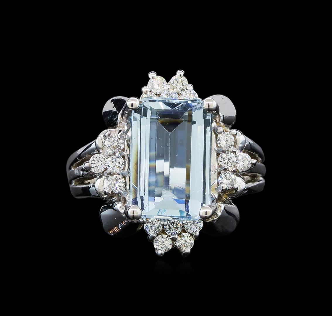 One electronically tested 14KT white gold ladies cast aquamarine and diamond ring with a bright polish finish. Identified with markings of "14K". Condition is new. Containing: One prong set emerald standard step cut natural aquamarine, measuring 12.60 x 8.50 x 5.53mm, approximate weight of 4.60ct., clarity is eye clean, type I, light, very slightly grayish, blue color, (GIA B 3/3), cut is good. Eighteen prong set round brilliant cut diamonds, measuring 1.90 - 1.90 x 1.14mm (depth est.) approximate total weight of 18 Stones = 0.50ct. Clarity: VS-2 to SI-1. Color: H - I, Cut is Good. Colored gemstones are presumed to have been subjected to commonly used enhancement processes. All diamonds and colored gemstones are graded in the mounting, unless otherwise stated. Total Weight of Colored Stones 4.60ct. Total Weight of Diamonds 0.50ct. Total Weight of Ring 10.10 grams. GGL Appraised at $3,685.00.