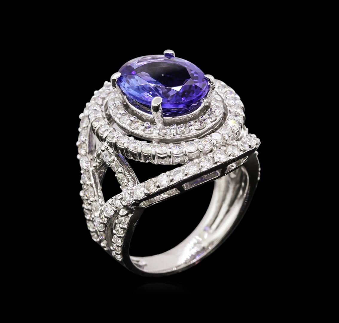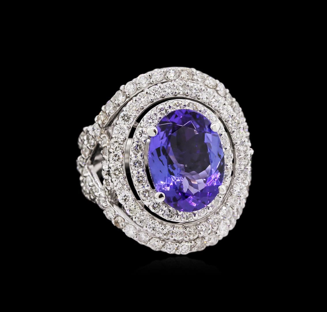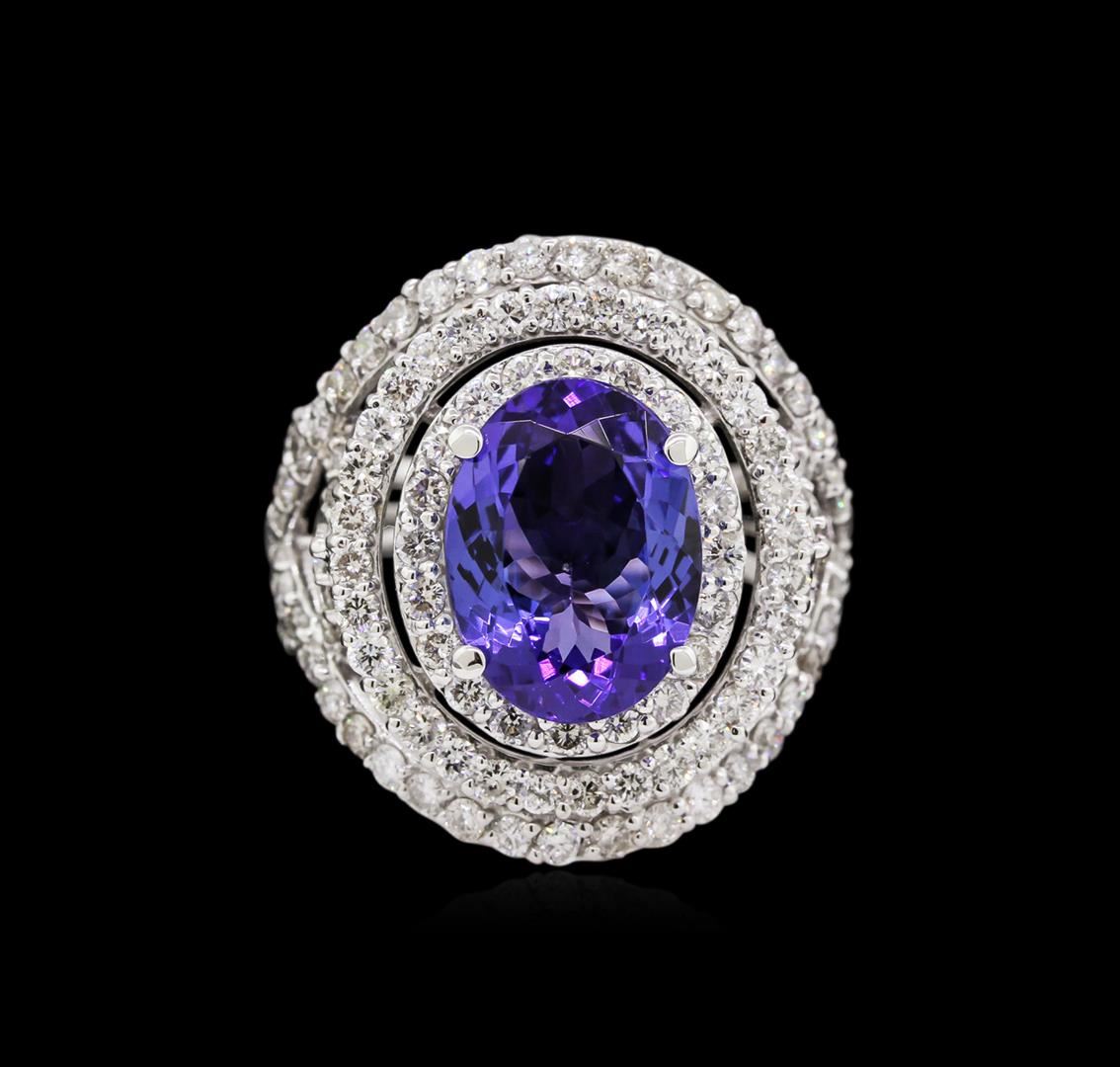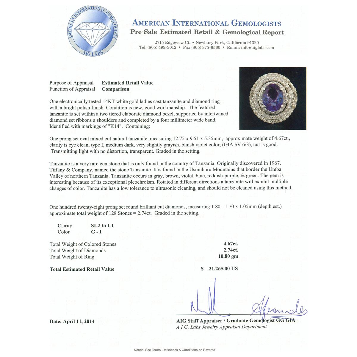 One electronically tested 14KT white gold ladies cast tanzanite and diamond ring with a bright polish finish. Condition is new, good workmanship. The featured tanzanite is set within a two tiered elaborate diamond bezel, supported by intertwined diamond set ribbons a shoulders and completed by a four millimeter wide band. Identified with markings of "K14". Containing: One prong set oval mixed cut natural tanzanite, measuring 12.75 x 9.51 x 5.35mm, approximate weight of 4.67ct., clarity is eye clean, type I, medium dark, very slightly grayish, bluish violet color, (GIA bV 6/3), cut is good. Transmitting light with no distortion, transparent. Graded in the setting. Tanzanite is a very rare gemstone that is only found in the country of Tanzania. Originally discovered in 1967. Tiffany & Company, named the stone Tanzanite. It is found in the Usumburu Mountains that border the Umba Valley of northern Tanzania. Tanzanite occurs in gray, brown, violet, blue, reddish-purple, & green. The gem is interesting because of its exceptional pleochroism. Rotated in different directions a tanzanite will exhibit multiple changes of color. Tanzanite has a low tolerance to ultrasonic cleaning, and should not be cleaned using this method. One Hundred Twenty-Eight prong set round brilliant cut diamonds, measuring 1.80 - 1.70 x 1.05mm (depth est.) approximate. Total Weight of 128 Stones = 2.74ct. Graded in the setting. Clarity: SI-2 to I-1. Color: G - I. Total Weight of Colored Stones 4.67ct. Total Weight of Diamonds 2.74ct. Total Weight of Ring 10.80 grams. AIG Appraised at $21,265.00.