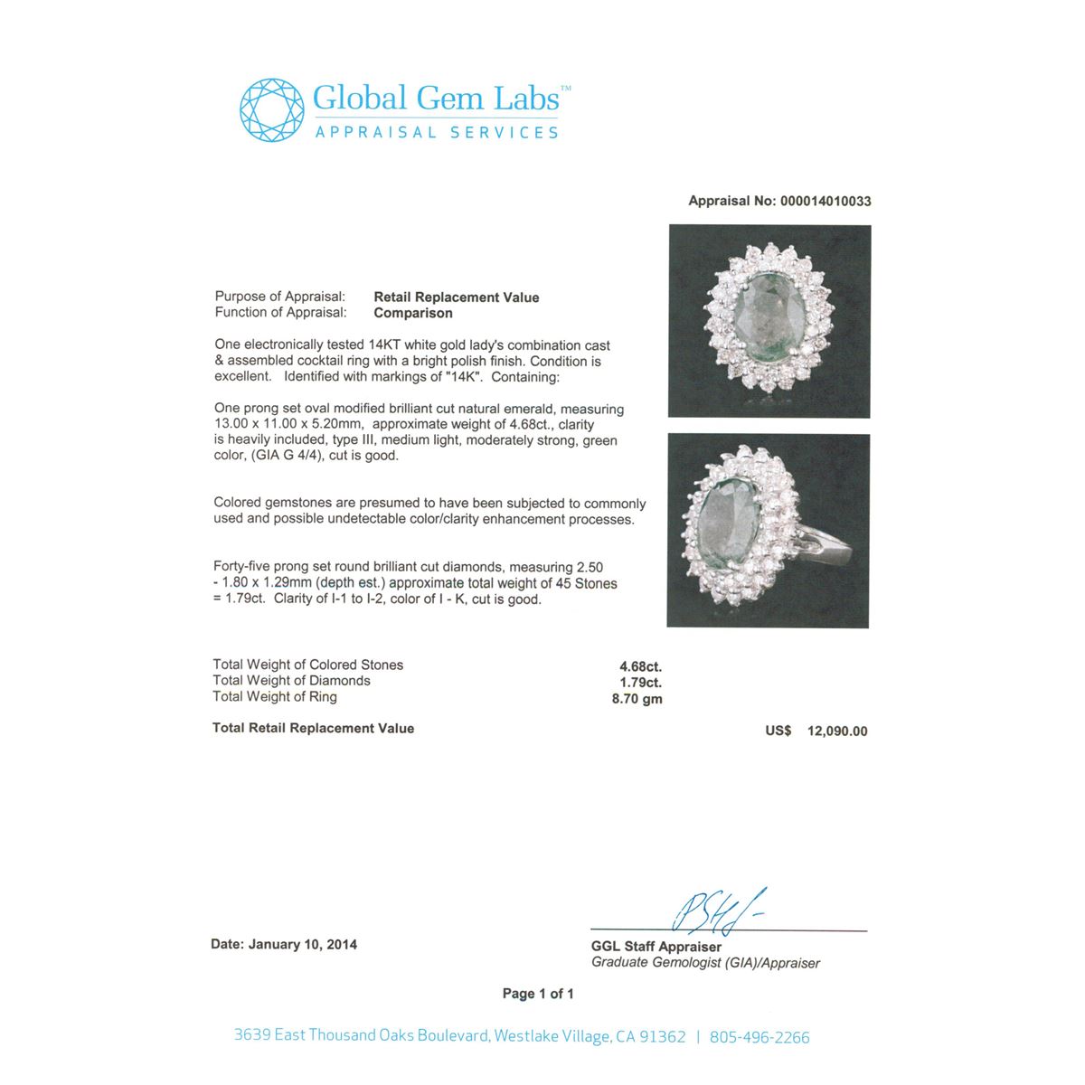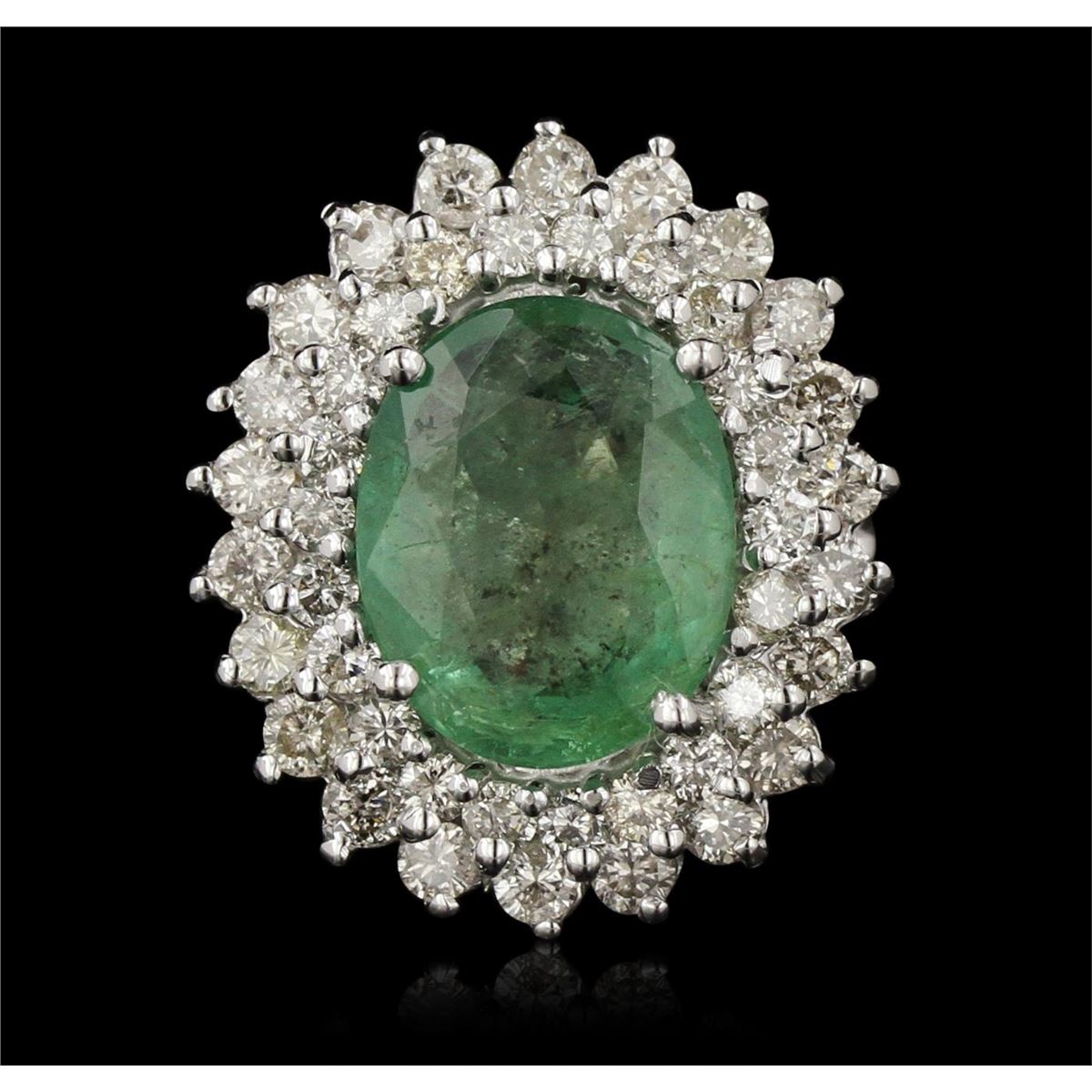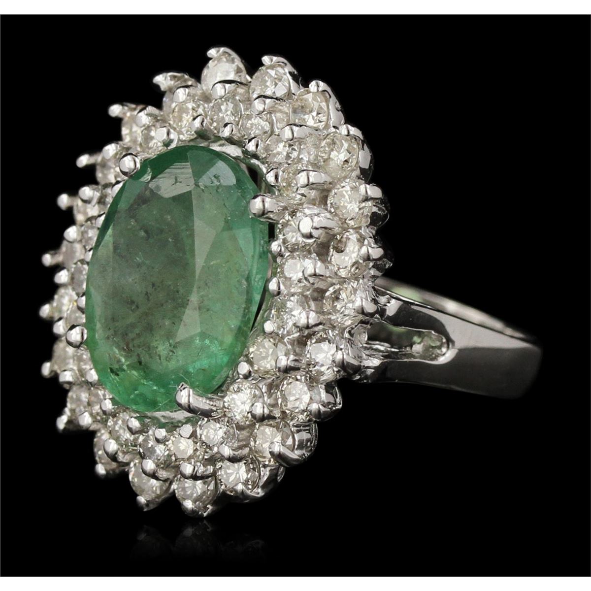 One electronically tested 14KT white gold Ladies combination cast & assembled cocktail ring with a bright polish finish. Identified with markings of "14K". Condition is excellent. Containing: One prong set oval modified brilliant cut natural emerald, measuring 13.00 x 11.00 x 5.20mm, approximate weight of 4.68ct., clarity is heavily included, type III, medium light, moderately strong, green color, (GIA G 4/4), cut is good. Colored gemstones are presumed to have been subjected to commonly used and possible undetectable color/clarity enhancement processes. Forty-Five prong set round brilliant cut diamonds, measuring 2.50 - 1.80 x 1.29mm (depth est.) approximate total weight of 45 Stones = 1.79ct. Clarity of I-1 to I-2, Color of I - K, Cut is Good. Total Weight of Colored Stones 4.68ct. Total Weight of Diamonds 1.79ct. Total Weight of Ring 8.70gm. GGL Appraised at $12,090.00.