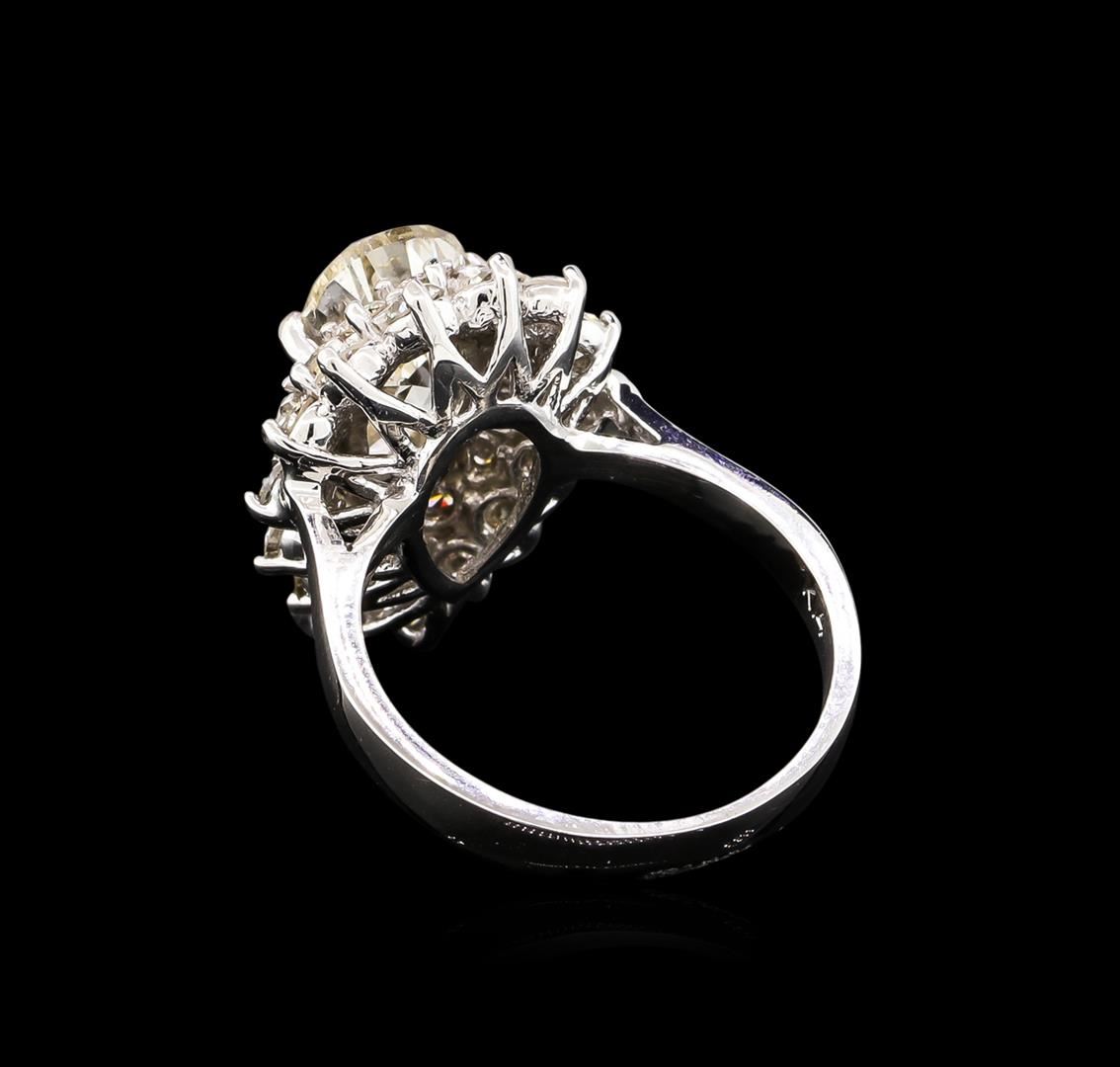 One electronically tested 14KT white gold ladies cast diamond ring with a bright polish finish. Condition is new, good workmanship. The featured diamond is set within a two tiered diamond bezel supported by tapering shoulders, completed by a three millimeter wide band. Identified with markings of "K14". Containing: One prong set pear shaped cut diamond, measuring 12.30 x 7.50 x 5.20mm (depth est.), 10.00.%. GTCF approximate weight of 3.13ct with a medium blue fluorescence. Faint secondary color throughout. Diamond Grading Report attached. Graded in the setting. Clarity: SI-2. Depth: 69.3%. Table 63.3%. Twenty-Nine prong set round brilliant cut diamonds, measuring 2.60 - 2.20 x 1.44mm (depth est.) approximate. Total Weight of 29 Stones = 1.56ct. Graded in the setting. Clarity: SI-1 to I-1. Color: I - K. Total Weight of Diamonds 4.69ct. Total Weight of Ring 6.29 grams. AIG Appraised at $47,040.00.