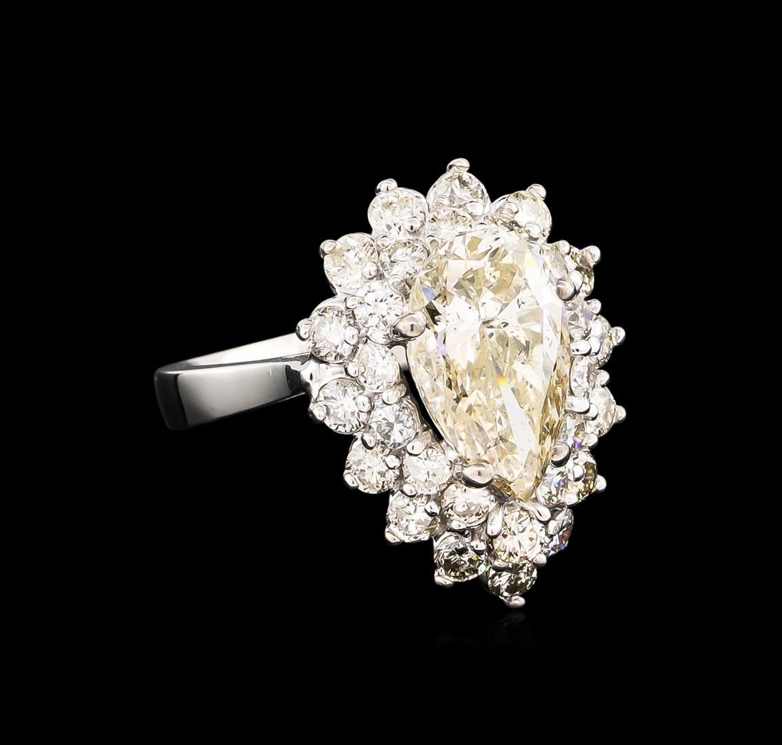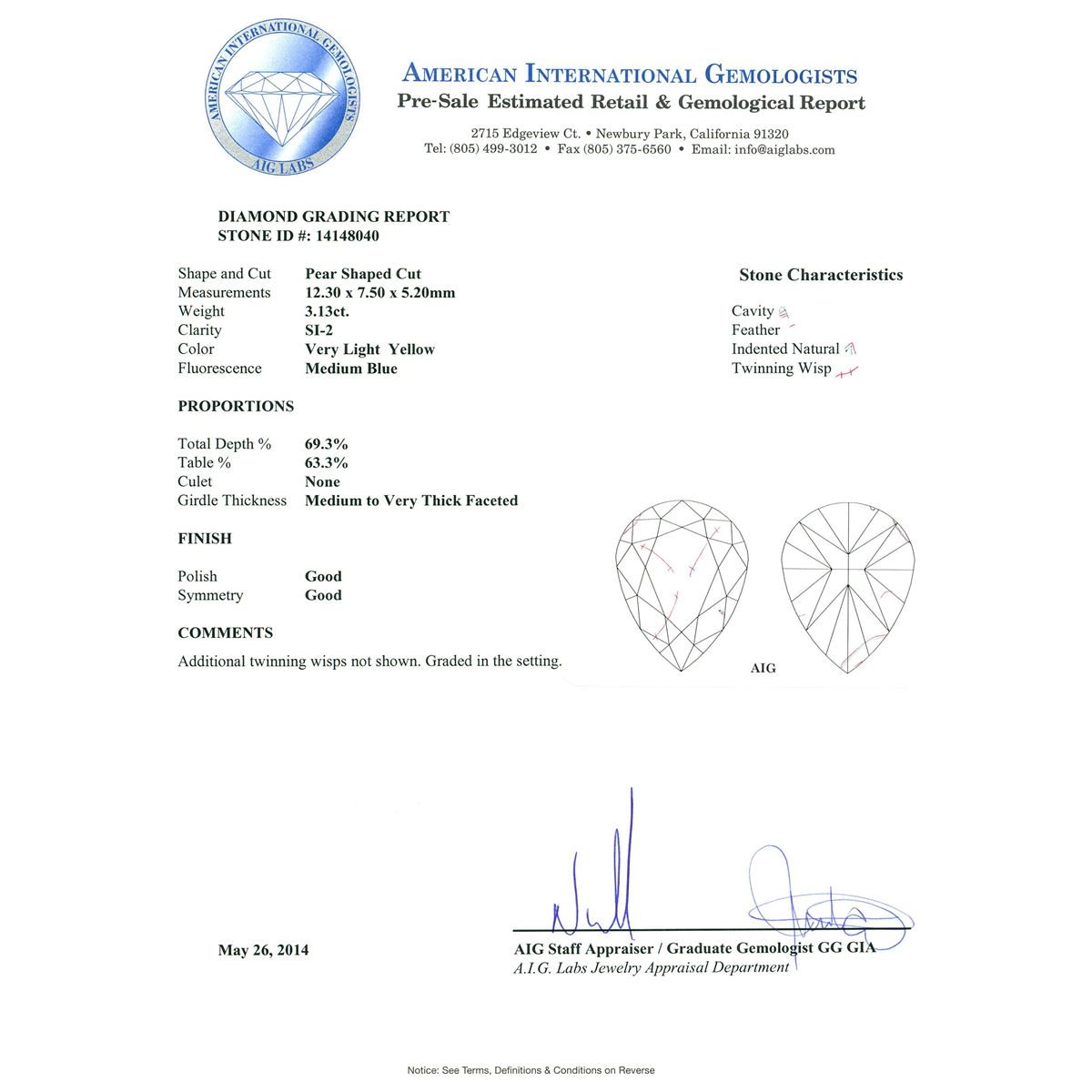 One electronically tested 14KT white gold ladies cast diamond ring with a bright polish finish. Condition is new, good workmanship. The featured diamond is set within a two tiered diamond bezel supported by tapering shoulders, completed by a three millimeter wide band. Identified with markings of "K14". Containing: One prong set pear shaped cut diamond, measuring 12.30 x 7.50 x 5.20mm (depth est.), 10.00.%. GTCF approximate weight of 3.13ct with a medium blue fluorescence. Faint secondary color throughout. Diamond Grading Report attached. Graded in the setting. Clarity: SI-2. Depth: 69.3%. Table 63.3%. Twenty-Nine prong set round brilliant cut diamonds, measuring 2.60 - 2.20 x 1.44mm (depth est.) approximate. Total Weight of 29 Stones = 1.56ct. Graded in the setting. Clarity: SI-1 to I-1. Color: I - K. Total Weight of Diamonds 4.69ct. Total Weight of Ring 6.29 grams. AIG Appraised at $47,040.00.