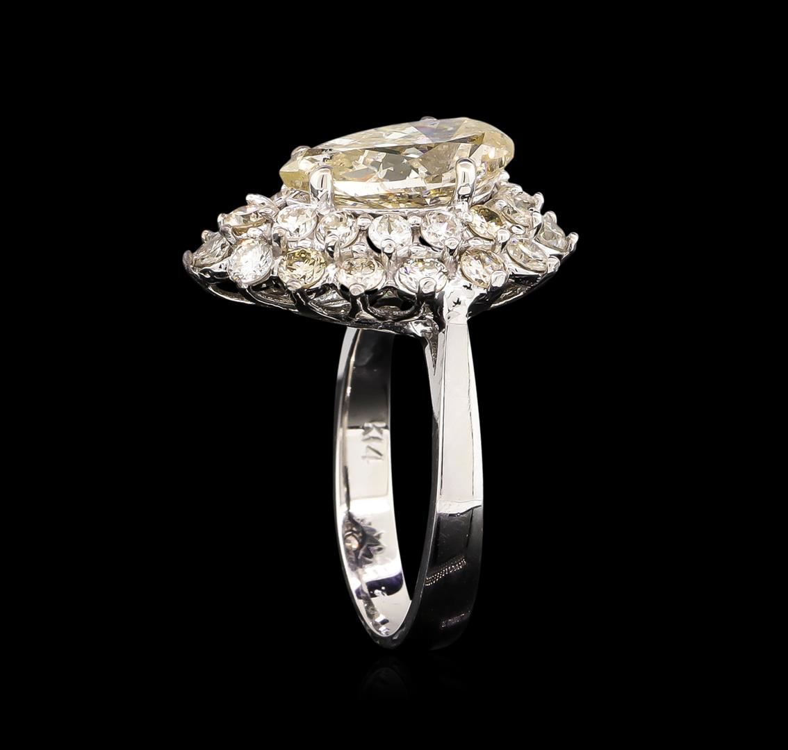 One electronically tested 14KT white gold ladies cast diamond ring with a bright polish finish. Condition is new, good workmanship. The featured diamond is set within a two tiered diamond bezel supported by tapering shoulders, completed by a three millimeter wide band. Identified with markings of "K14". Containing: One prong set pear shaped cut diamond, measuring 12.30 x 7.50 x 5.20mm (depth est.), 10.00.%. GTCF approximate weight of 3.13ct with a medium blue fluorescence. Faint secondary color throughout. Diamond Grading Report attached. Graded in the setting. Clarity: SI-2. Depth: 69.3%. Table 63.3%. Twenty-Nine prong set round brilliant cut diamonds, measuring 2.60 - 2.20 x 1.44mm (depth est.) approximate. Total Weight of 29 Stones = 1.56ct. Graded in the setting. Clarity: SI-1 to I-1. Color: I - K. Total Weight of Diamonds 4.69ct. Total Weight of Ring 6.29 grams. AIG Appraised at $47,040.00.