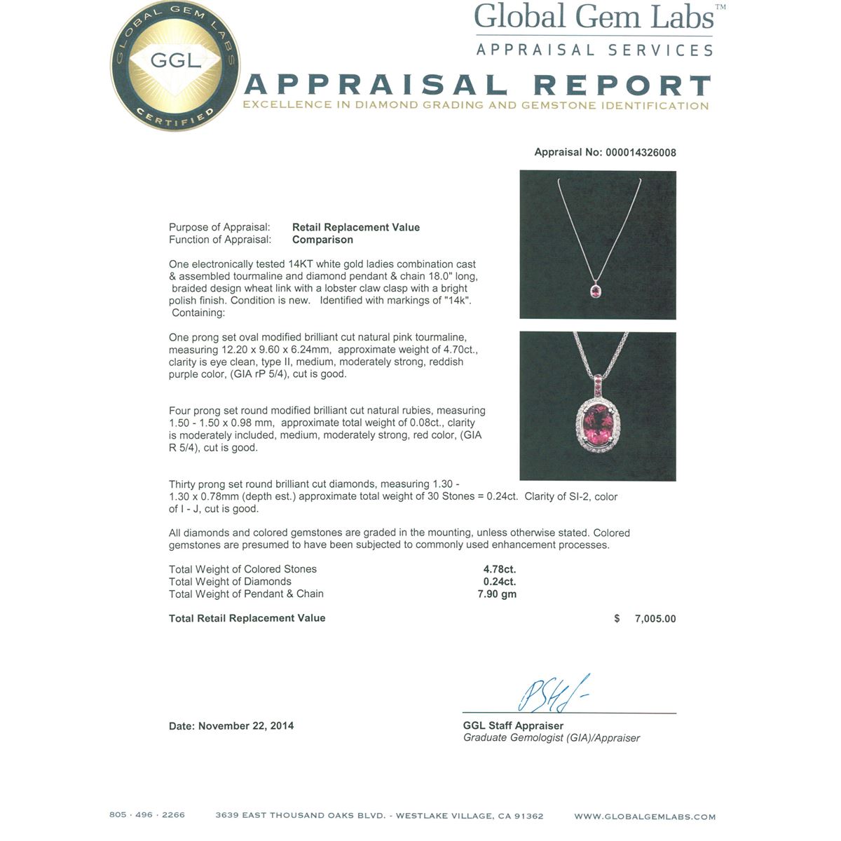 One electronically tested 14KT white gold ladies combination cast & assembled tourmaline and diamond pendant & chain 18.0" long, braided design wheat link with a lobster claw clasp with a bright polish finish. Identified with markings of "14k". Condition is new. Containing: One prong set oval modified brilliant cut natural pink tourmaline, measuring 12.20 x 9.60 x 6.24mm, approximate weight of 4.70ct., clarity is eye clean, type II, medium, moderately strong, reddish purple color, (GIA rP 5/4), cut is good. Four prong set round modified brilliant cut natural rubies, measuring 1.50 - 1.50 x 0.98 mm, approximate total weight of 0.08ct., clarity is moderately included, medium, moderately strong, red color, (GIA R 5/4), cut is good. Thirty prong set round brilliant cut diamonds, measuring 1.30 - 1.30 x 0.78mm (depth est.) approximate total weight of 30 Stones = 0.24ct. Clarity: SI-2. Color: I - J, Cut is Good. All diamonds and colored gemstones are graded in the mounting, unless otherwise stated. Colored gemstones are presumed to have been subjected to commonly used enhancement processes. Total Weight of Colored Stones 4.78ct. Total Weight of Diamonds 0.24ct. Total Weight of Pendant & Chain 7.90 grams. GGL Appraised at $7,005.00.