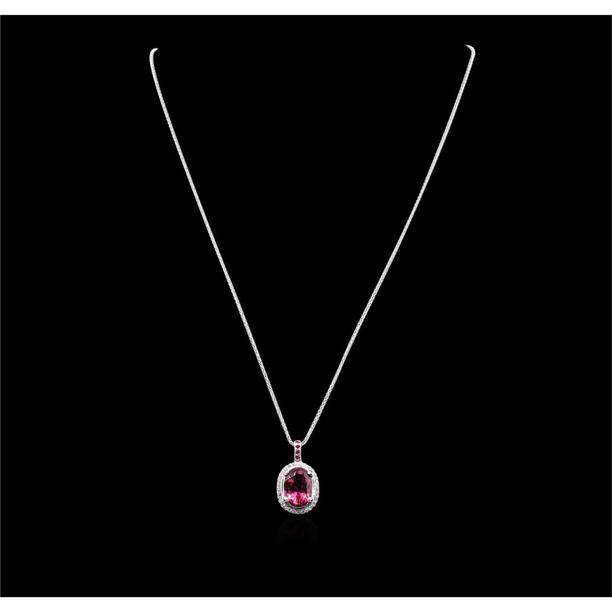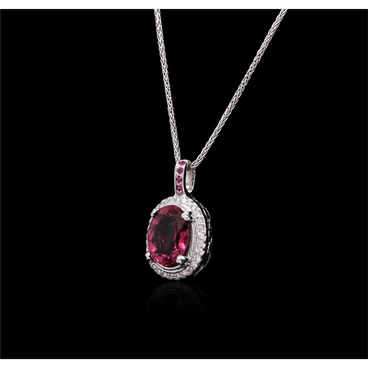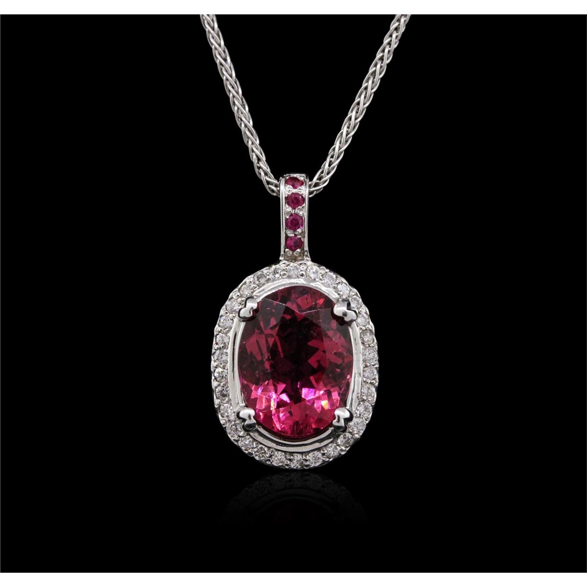 One electronically tested 14KT white gold ladies combination cast & assembled tourmaline and diamond pendant & chain 18.0" long, braided design wheat link with a lobster claw clasp with a bright polish finish. Identified with markings of "14k". Condition is new. Containing: One prong set oval modified brilliant cut natural pink tourmaline, measuring 12.20 x 9.60 x 6.24mm, approximate weight of 4.70ct., clarity is eye clean, type II, medium, moderately strong, reddish purple color, (GIA rP 5/4), cut is good. Four prong set round modified brilliant cut natural rubies, measuring 1.50 - 1.50 x 0.98 mm, approximate total weight of 0.08ct., clarity is moderately included, medium, moderately strong, red color, (GIA R 5/4), cut is good. Thirty prong set round brilliant cut diamonds, measuring 1.30 - 1.30 x 0.78mm (depth est.) approximate total weight of 30 Stones = 0.24ct. Clarity: SI-2. Color: I - J, Cut is Good. All diamonds and colored gemstones are graded in the mounting, unless otherwise stated. Colored gemstones are presumed to have been subjected to commonly used enhancement processes. Total Weight of Colored Stones 4.78ct. Total Weight of Diamonds 0.24ct. Total Weight of Pendant & Chain 7.90 grams. GGL Appraised at $7,005.00.