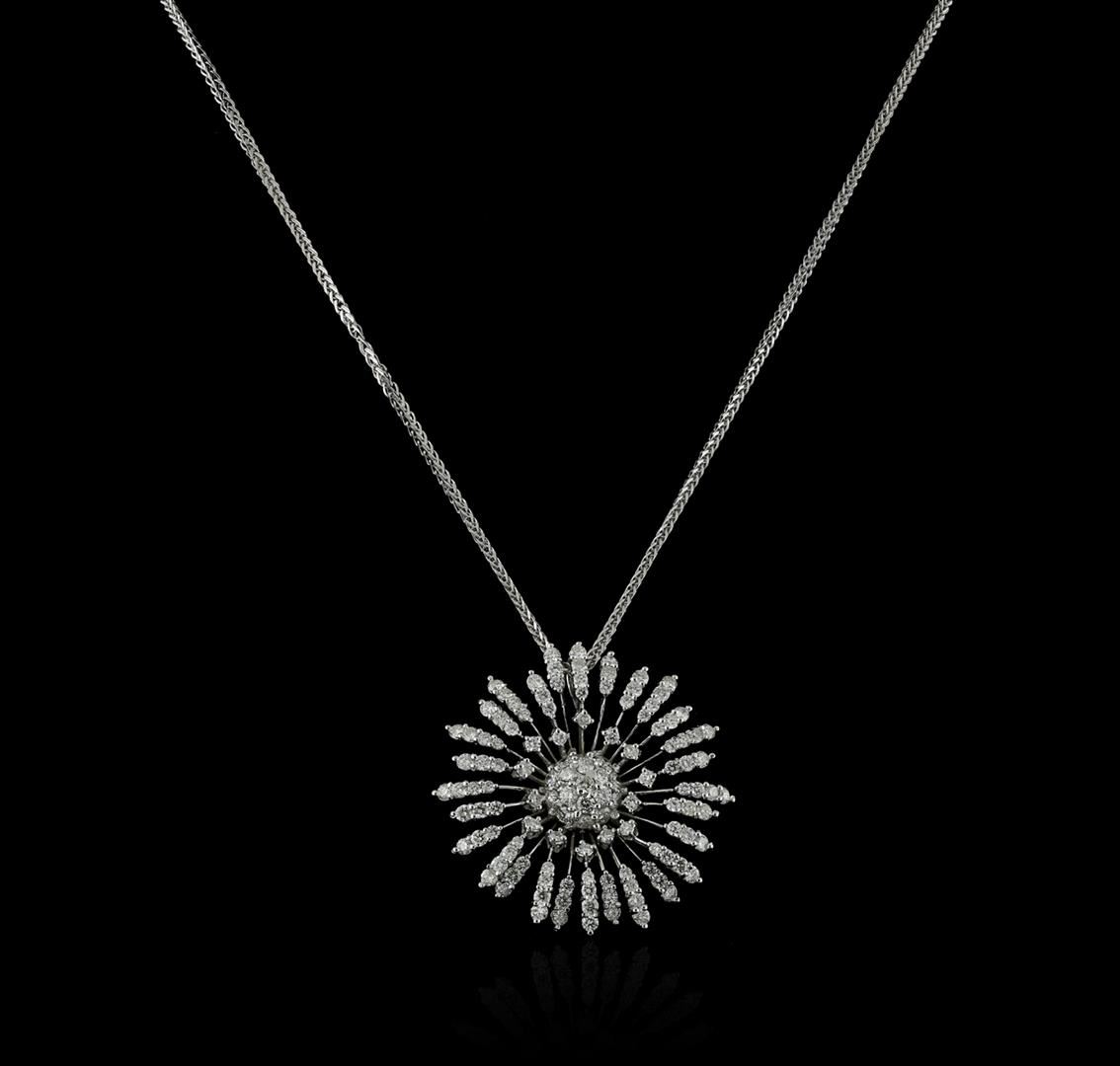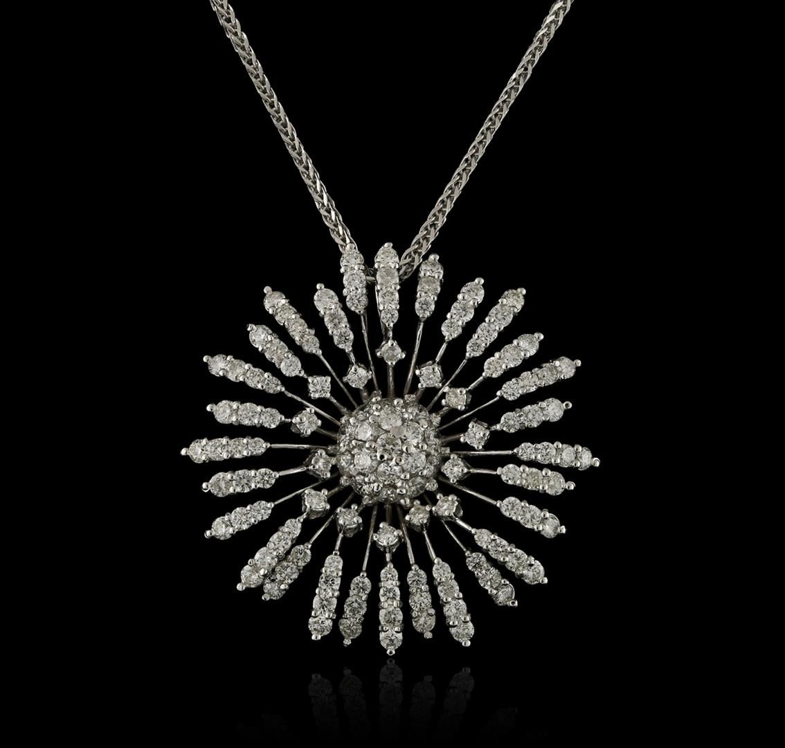 One electronically tested 14KT white gold ladies cast diamond pendant & chain 18.0" long, with a lobster claw clasp with a bright polish finish. Identified with markings of "14K". Condition is new. Containing: One Hundred Twenty-Seven prong set round brilliant cut diamonds, measuring 2.30 - 1.80 x 1.23mm (depth est.) approximate total weight of 127 Stones = 4.70ct. Clarity: SI-1 to SI-2. Color: H - I, Cut is Good. All diamonds are graded in the mounting, unless otherwise stated. Total Weight of Diamonds 4.70ct. Total Weight of Pendant & Chain 16.50 grams. GGL Appraised at $11,330.00.