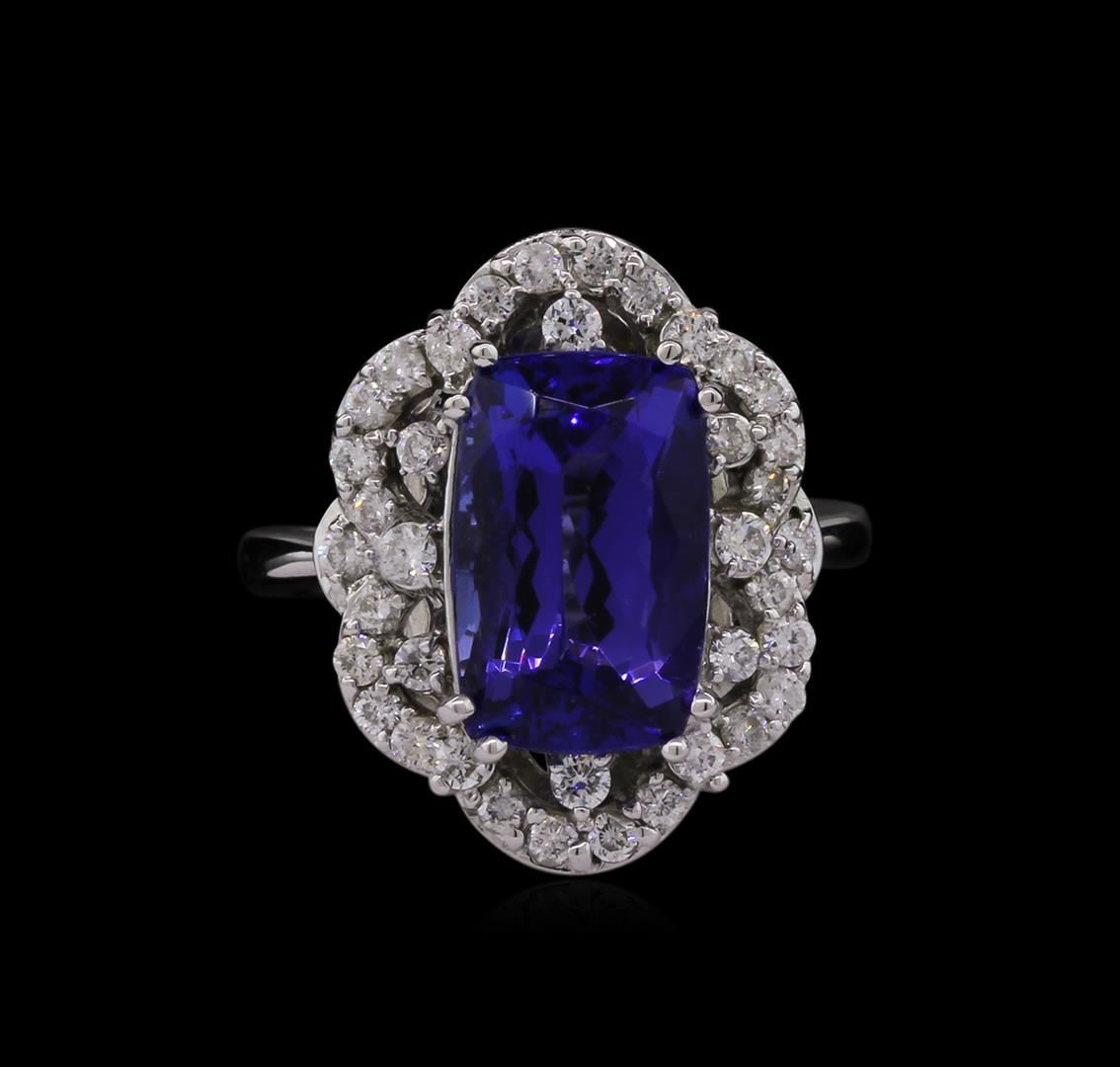 One electronically tested 14KT white gold ladies cast tanzanite and diamond ring with a bright polish finish. Identified with markings of "14K". Condition is new. Containing: One prong set rectangular cushion modified brilliant cut natural tanzanite, measuring 12.28 x 7.83 x 6.22mm, approximate weight of 4.71ct., clarity is eye clean, type I, medium, moderately strong, violet color, (GIA V 5/4), cut is good. Thirty-Seven prong set round brilliant cut diamonds, measuring 1.60 - 1.60 x 0.96mm (depth est.) approximate total weight of 37 Stones = 0.55ct. Clarity: I-1. Color: H - I, Cut is Good. Colored gemstones are presumed to have been subjected to commonly used enhancement processes. All diamonds and colored gemstones are graded in the mounting, unless otherwise stated. Total Weight of Colored Stones 4.71ct. Total Weight of Diamonds 0.55ct. Total Weight of Ring 6.40 grams. GGL Appraised at $5,130.00.