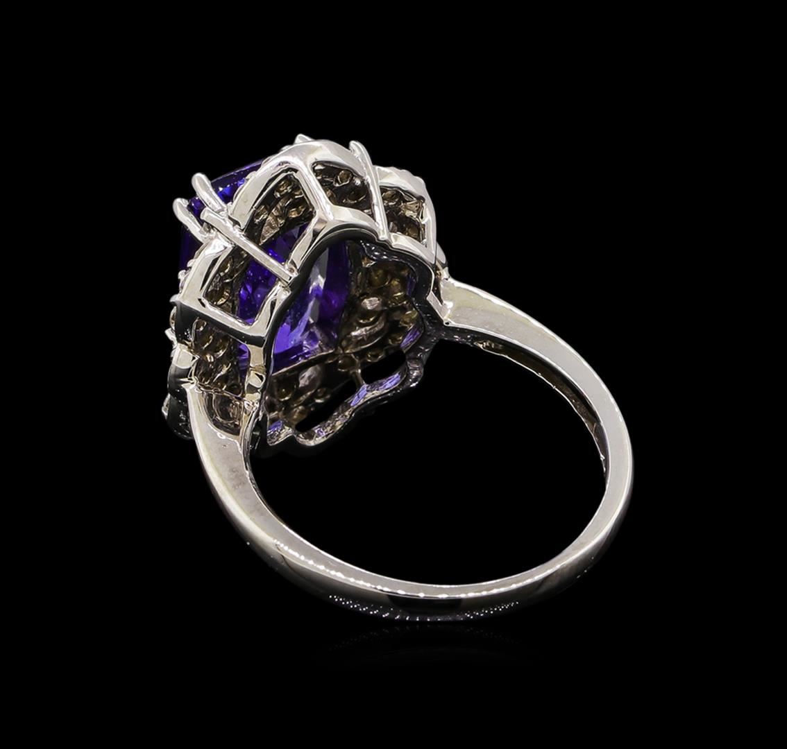 One electronically tested 14KT white gold ladies cast tanzanite and diamond ring with a bright polish finish. Identified with markings of "14K". Condition is new. Containing: One prong set rectangular cushion modified brilliant cut natural tanzanite, measuring 12.28 x 7.83 x 6.22mm, approximate weight of 4.71ct., clarity is eye clean, type I, medium, moderately strong, violet color, (GIA V 5/4), cut is good. Thirty-Seven prong set round brilliant cut diamonds, measuring 1.60 - 1.60 x 0.96mm (depth est.) approximate total weight of 37 Stones = 0.55ct. Clarity: I-1. Color: H - I, Cut is Good. Colored gemstones are presumed to have been subjected to commonly used enhancement processes. All diamonds and colored gemstones are graded in the mounting, unless otherwise stated. Total Weight of Colored Stones 4.71ct. Total Weight of Diamonds 0.55ct. Total Weight of Ring 6.40 grams. GGL Appraised at $5,130.00.