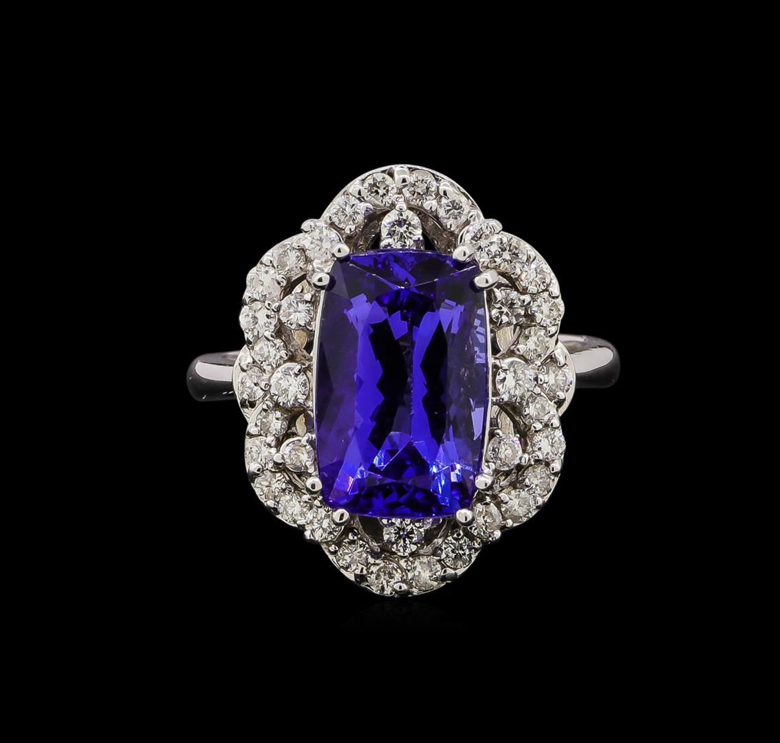 One electronically tested 14KT white gold ladies cast tanzanite and diamond ring with a bright polish finish. Identified with markings of "14K". Condition is new. Containing: One prong set rectangular cushion modified brilliant cut natural tanzanite, measuring 12.28 x 7.83 x 6.22mm, approximate weight of 4.71ct., clarity is eye clean, type I, medium, moderately strong, violet color, (GIA V 5/4), cut is good. Thirty-Seven prong set round brilliant cut diamonds, measuring 1.60 - 1.60 x 0.96mm (depth est.) approximate total weight of 37 Stones = 0.55ct. Clarity: I-1. Color: H - I, Cut is Good. Colored gemstones are presumed to have been subjected to commonly used enhancement processes. All diamonds and colored gemstones are graded in the mounting, unless otherwise stated. Total Weight of Colored Stones 4.71ct. Total Weight of Diamonds 0.55ct. Total Weight of Ring 6.40 grams. GGL Appraised at $5,130.00.