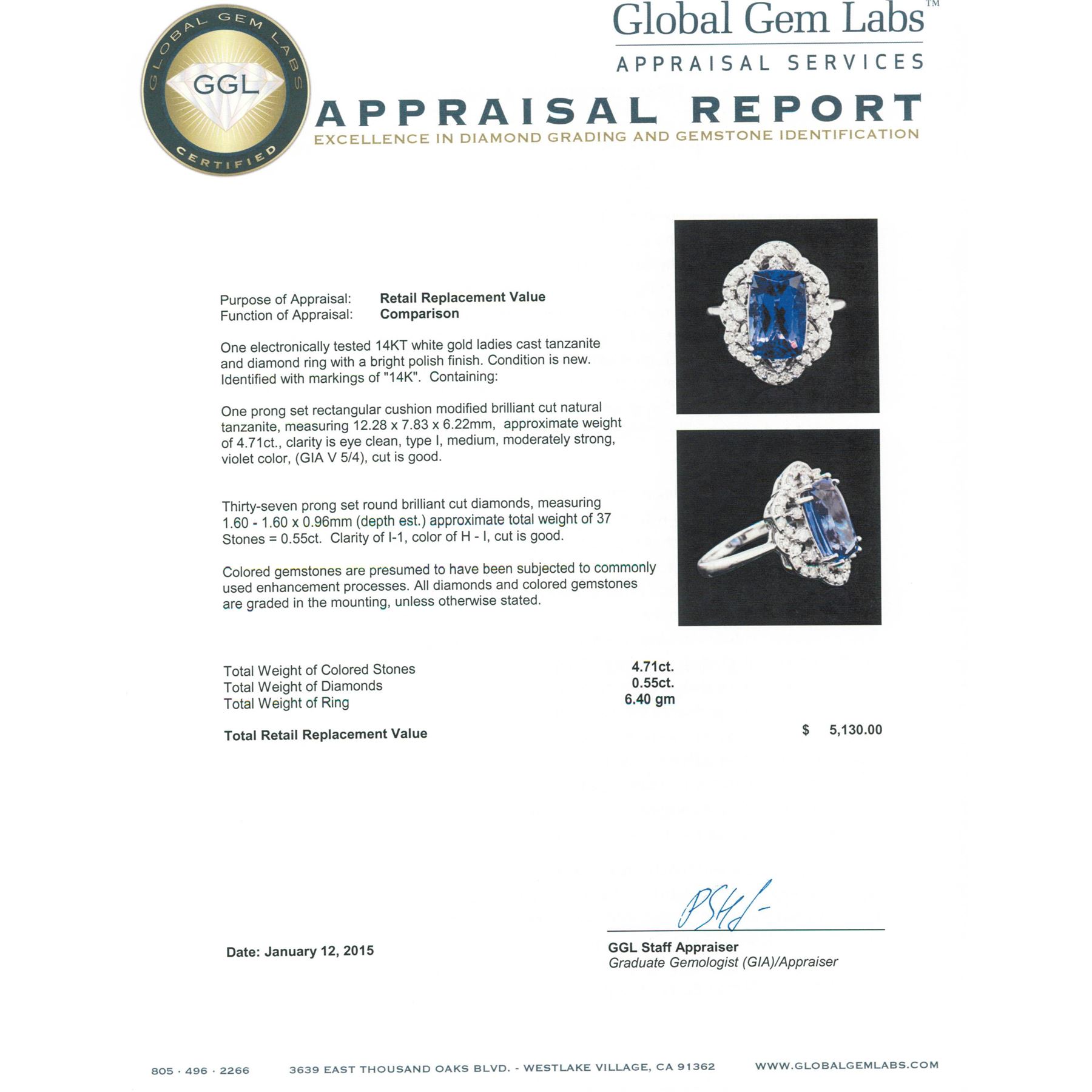 One electronically tested 14KT white gold ladies cast tanzanite and diamond ring with a bright polish finish. Identified with markings of "14K". Condition is new. Containing: One prong set rectangular cushion modified brilliant cut natural tanzanite, measuring 12.28 x 7.83 x 6.22mm, approximate weight of 4.71ct., clarity is eye clean, type I, medium, moderately strong, violet color, (GIA V 5/4), cut is good. Thirty-Seven prong set round brilliant cut diamonds, measuring 1.60 - 1.60 x 0.96mm (depth est.) approximate total weight of 37 Stones = 0.55ct. Clarity: I-1. Color: H - I, Cut is Good. Colored gemstones are presumed to have been subjected to commonly used enhancement processes. All diamonds and colored gemstones are graded in the mounting, unless otherwise stated. Total Weight of Colored Stones 4.71ct. Total Weight of Diamonds 0.55ct. Total Weight of Ring 6.40 grams. GGL Appraised at $5,130.00.