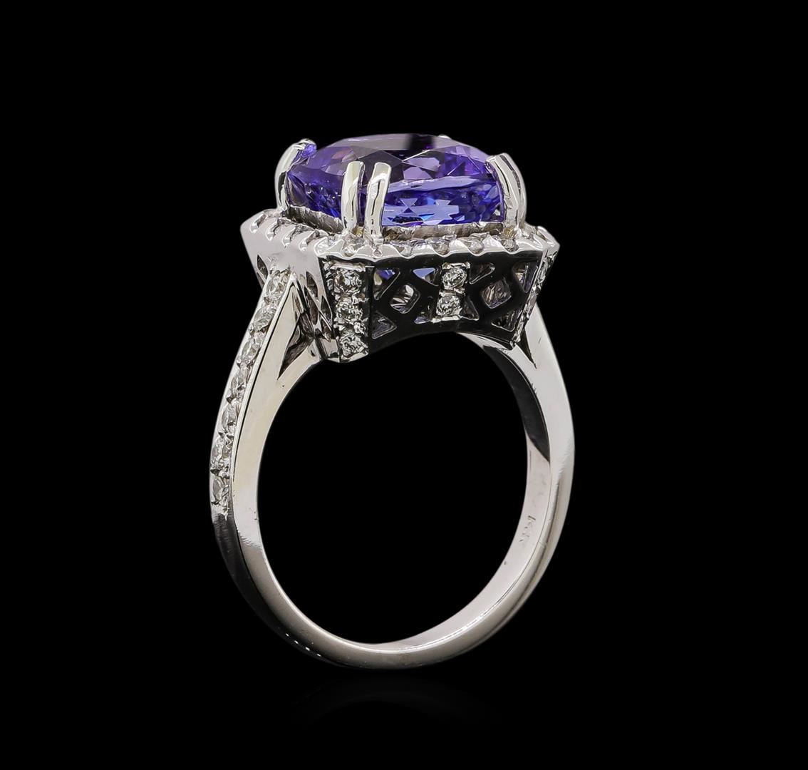 One electronically tested 14KT white gold ladies cast tanzanite and diamond ring with a bright polish finish. Identified with markings of "14K". Condition is new. Containing: One prong set square cushion modified brilliant cut natural tanzanite, measuring 9.70 x 9.78 x 6.33mm, approximate weight of 4.73ct., clarity is eye clean, type I, medium light, very slightly grayish, violet color, (GIA V 4/3), cut is good. Fifty-Two prong set round brilliant cut diamonds, measuring 1.50 - 1.20 x 0.81mm (depth est.) approximate total weight of 52 Stones = 0.47ct. Clarity: SI-2 to I-1. Color: I - J, Cut is Good. Colored gemstones are presumed to have been subjected to commonly used enhancement processes. All diamonds and colored gemstones are graded in the mounting, unless otherwise stated. Total Weight of Colored Stones 4.73ct. Total Weight of Diamonds 0.47ct. Total Weight of Ring 7.60 grams. GGL Appraised at $4,970.00.