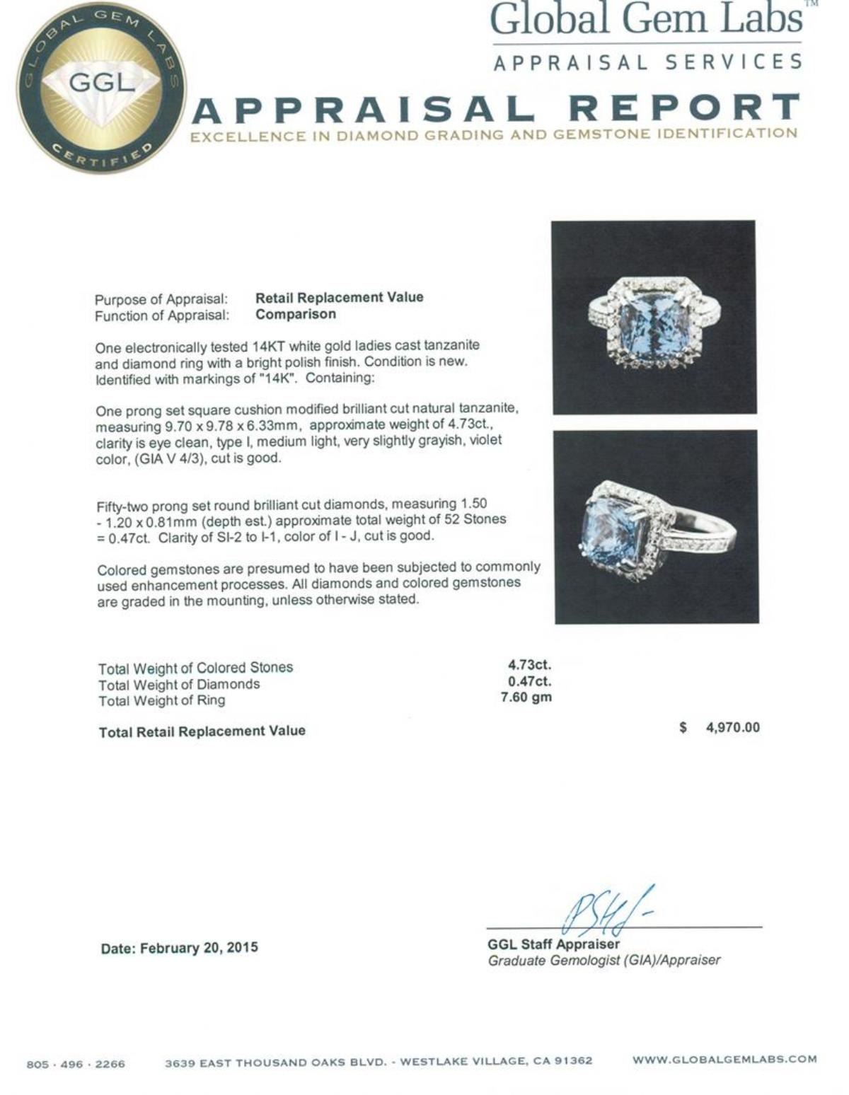One electronically tested 14KT white gold ladies cast tanzanite and diamond ring with a bright polish finish. Identified with markings of "14K". Condition is new. Containing: One prong set square cushion modified brilliant cut natural tanzanite, measuring 9.70 x 9.78 x 6.33mm, approximate weight of 4.73ct., clarity is eye clean, type I, medium light, very slightly grayish, violet color, (GIA V 4/3), cut is good. Fifty-Two prong set round brilliant cut diamonds, measuring 1.50 - 1.20 x 0.81mm (depth est.) approximate total weight of 52 Stones = 0.47ct. Clarity: SI-2 to I-1. Color: I - J, Cut is Good. Colored gemstones are presumed to have been subjected to commonly used enhancement processes. All diamonds and colored gemstones are graded in the mounting, unless otherwise stated. Total Weight of Colored Stones 4.73ct. Total Weight of Diamonds 0.47ct. Total Weight of Ring 7.60 grams. GGL Appraised.
