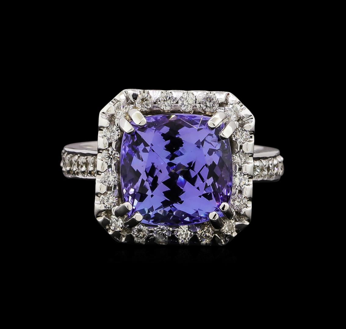 One electronically tested 14KT white gold ladies cast tanzanite and diamond ring with a bright polish finish. Identified with markings of "14K". Condition is new. Containing: One prong set square cushion modified brilliant cut natural tanzanite, measuring 9.70 x 9.78 x 6.33mm, approximate weight of 4.73ct., clarity is eye clean, type I, medium light, very slightly grayish, violet color, (GIA V 4/3), cut is good. Fifty-Two prong set round brilliant cut diamonds, measuring 1.50 - 1.20 x 0.81mm (depth est.) approximate total weight of 52 Stones = 0.47ct. Clarity: SI-2 to I-1. Color: I - J, Cut is Good. Colored gemstones are presumed to have been subjected to commonly used enhancement processes. All diamonds and colored gemstones are graded in the mounting, unless otherwise stated. Total Weight of Colored Stones 4.73ct. Total Weight of Diamonds 0.47ct. Total Weight of Ring 7.60 grams. GGL Appraised.