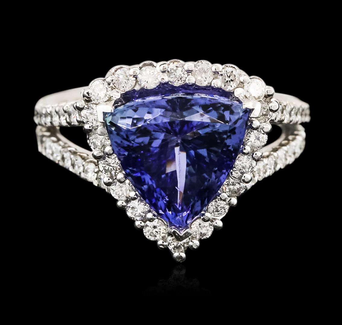 One electronically tested 14KT white gold ladies cast tanzanite and diamond ring with a bright polish finish. Identified with markings of "14K". Condition is new. Containing: One prong set triangle modified brilliant cut natural tanzanite, measuring 11.00 x 11.00 x 6.50mm, approximate weight of 4.74ct., clarity is eye clean, type I, medium light, very slightly grayish, bluish violet color, (GIA bV 4/3), cut is good. Seventy-Four prong set round brilliant cut diamonds, measuring 1.50 - 1.50 x 0.90mm (depth est.) approximate total weight of 74 Stones = 0.91ct. Clarity: SI-2 to I-1. Color: H - I, Cut is Good. Colored gemstones are presumed to have been subjected to commonly used enhancement processes. All diamonds and colored gemstones are graded in the mounting, unless otherwise stated. Total Weight of Colored Stones 4.74ct. Total Weight of Diamonds 0.91ct. Total Weight of Ring 6.20 grams. GGL Appraised at $5,780.00.